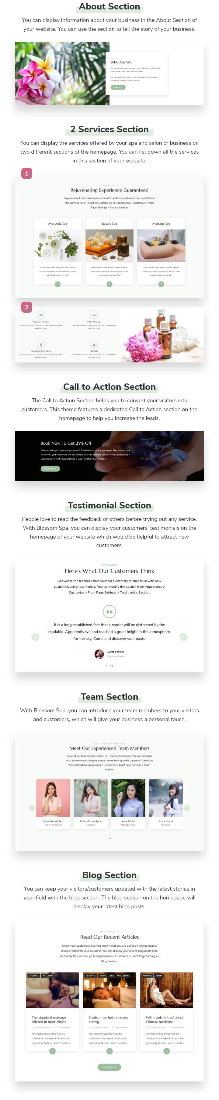 People love to read the feedback of others before trying out any service. With Blossom Spa, you can display your customers’ testimonials on the homepage of your website which would be helpful to attract new customers.
