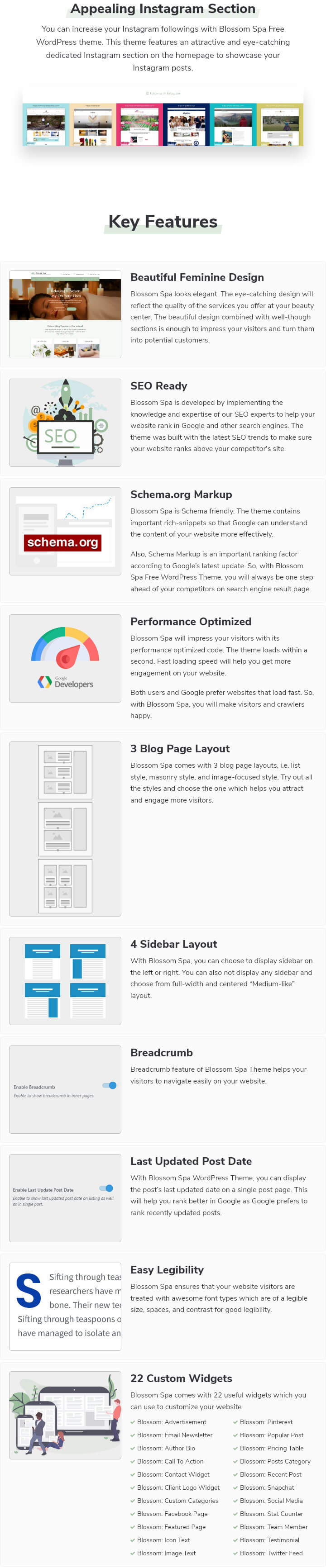 Also, Schema Markup is an important ranking factor according to Google’s latest update. So, with Blossom Spa Free WordPress Theme, you will always be one step ahead of your competitors on search engine result page.