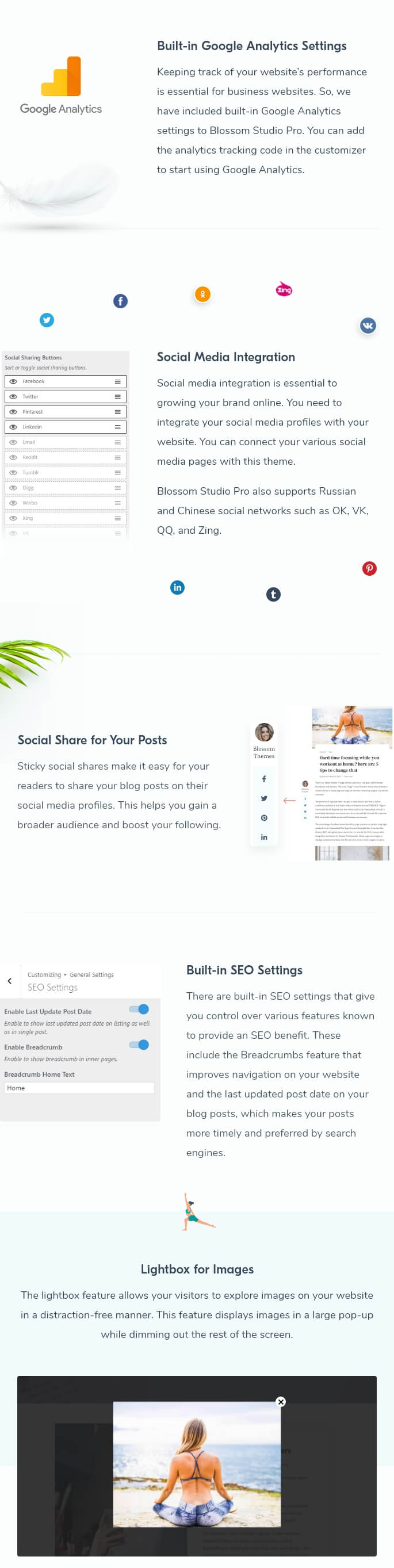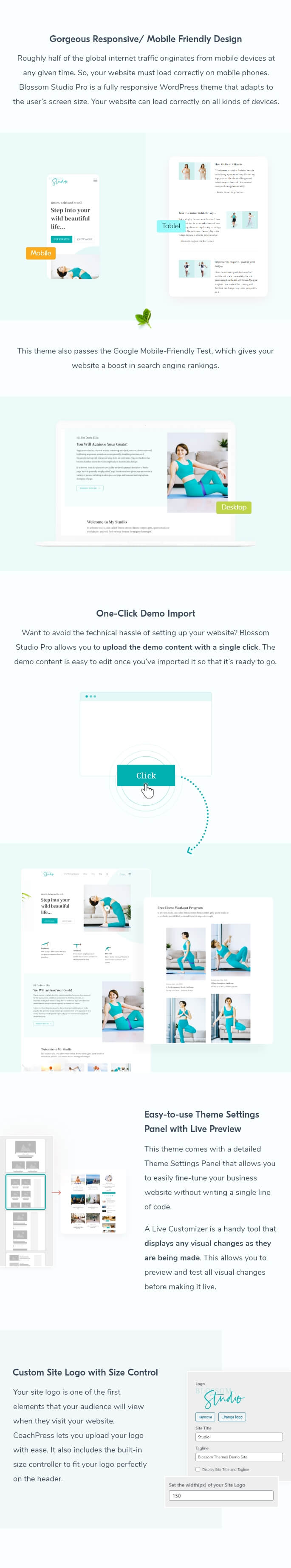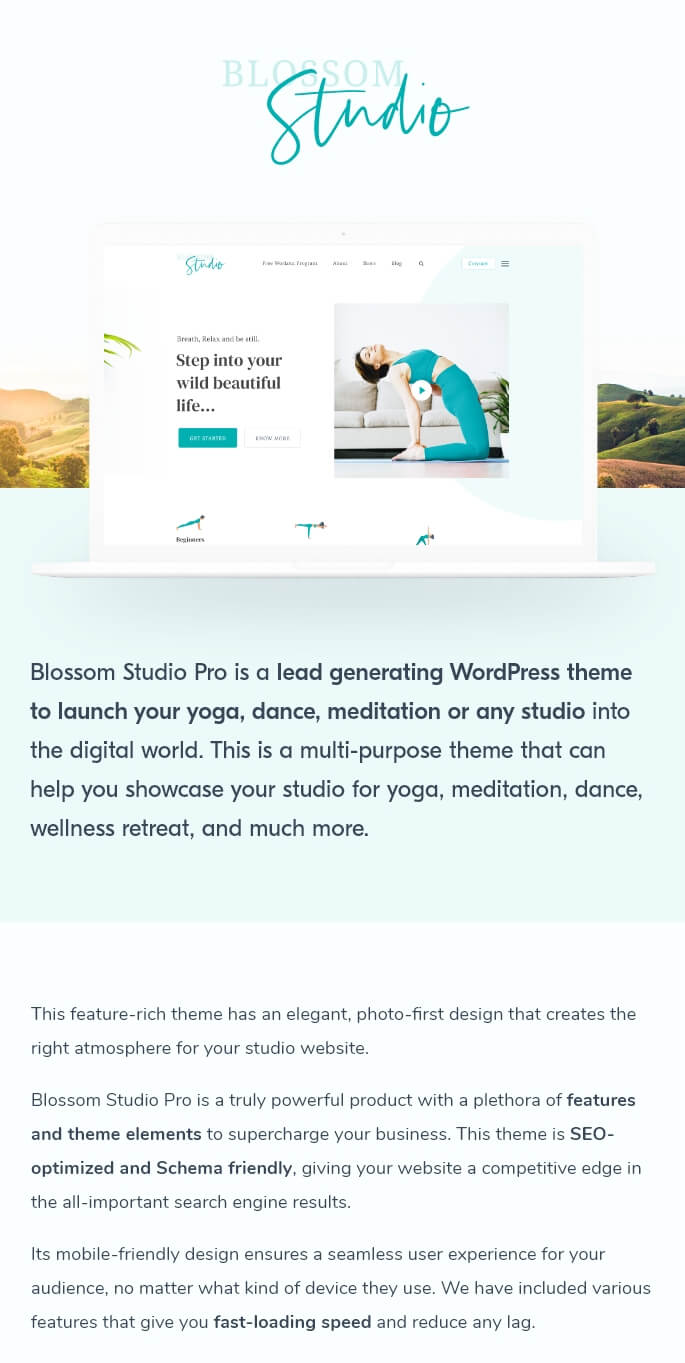 Blossom Studio Pro is a lead generating WordPress theme to launch your yoga, dance, meditation or any studio into the digital world. This is a multi-purpose theme that can help you showcase your studio for yoga, meditation, dance, wellness retreat, and much more. This feature-rich theme has an elegant, photo-first design that creates the right atmosphere for your studio website.