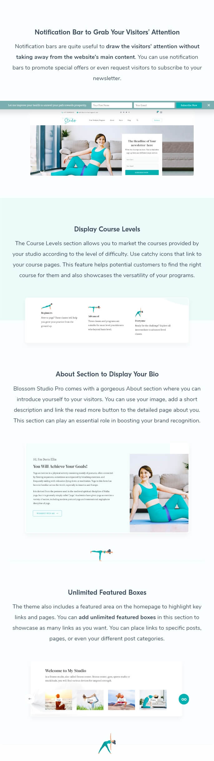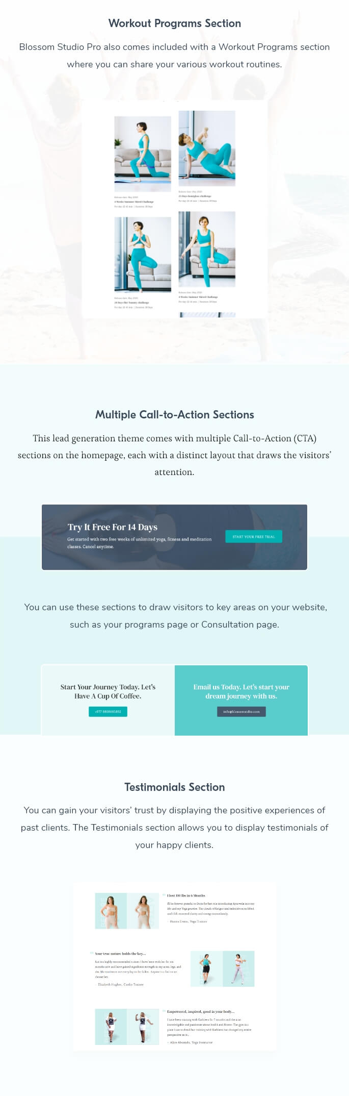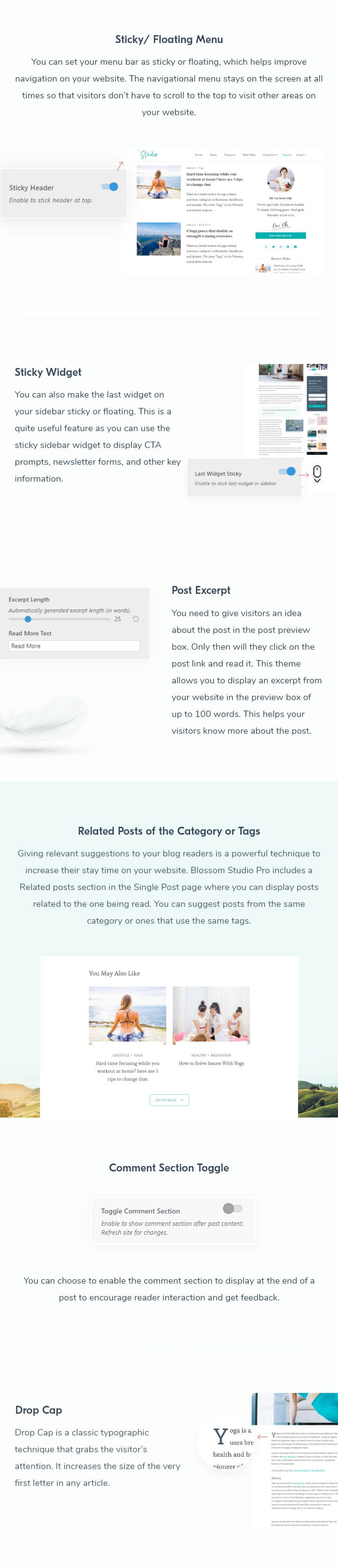 Blossom Studio Pro is a lead generating WordPress theme to launch your yoga, dance, meditation or any studio into the digital world. This is a multi-purpose theme that can help you showcase your studio for yoga, meditation, dance, wellness retreat, and much more. This feature-rich theme has an elegant, photo-first design that creates the right atmosphere for your studio website.