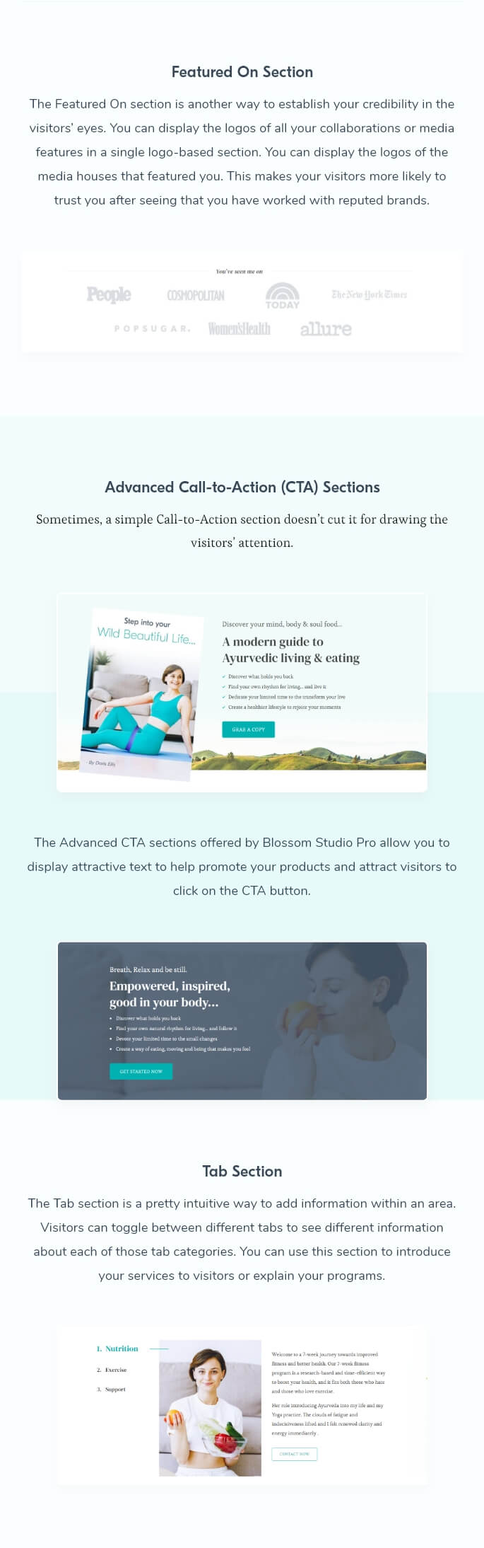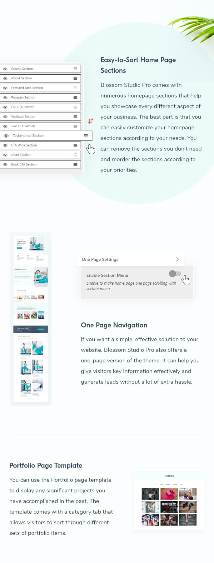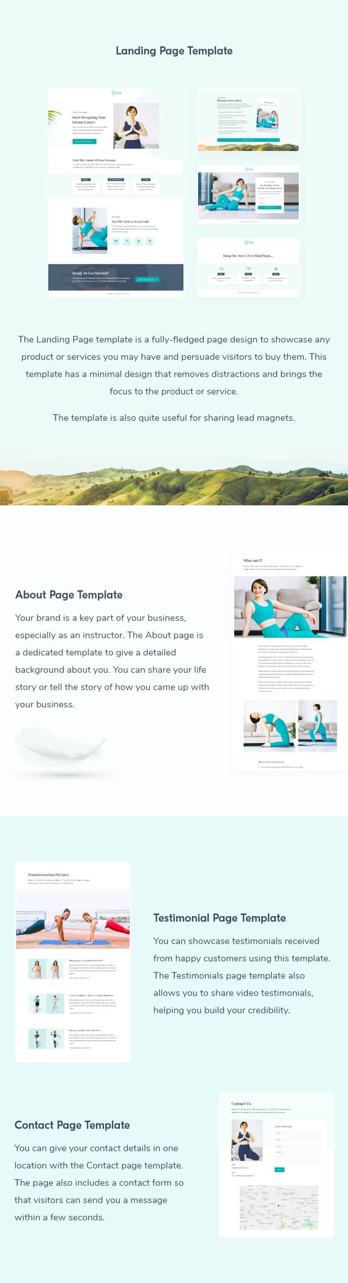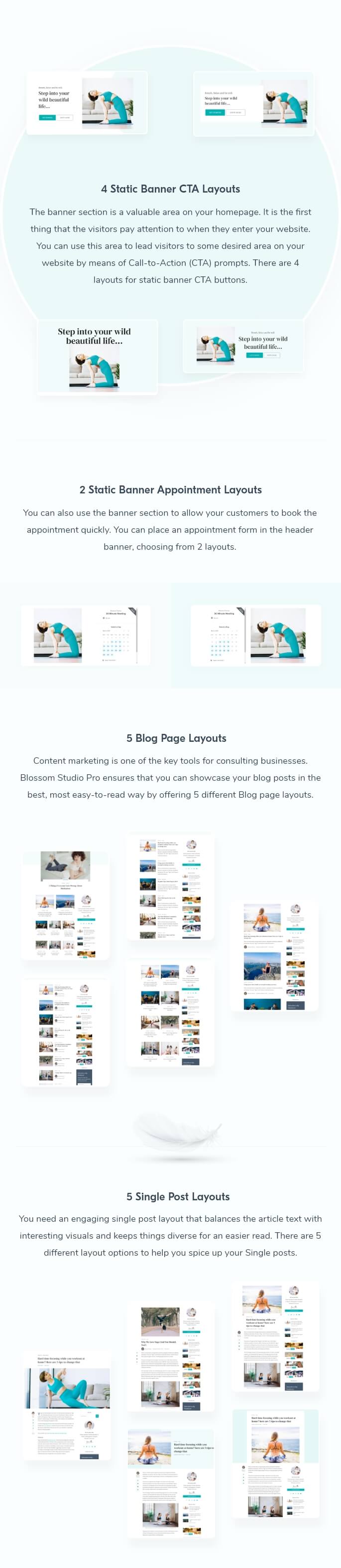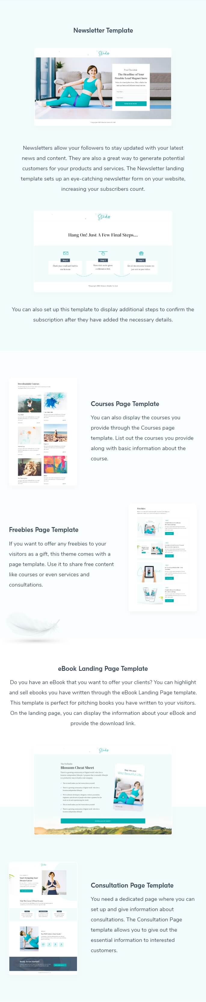 Blossom Studio Pro also comes with tailor-built inner page templates to support every aspect of your business. You get a pre-built landing page template to promote your programs, books, and products. You can showcase your courses through the Course page template, and there is even a Consultation page template to boost appointments and attract new customers.