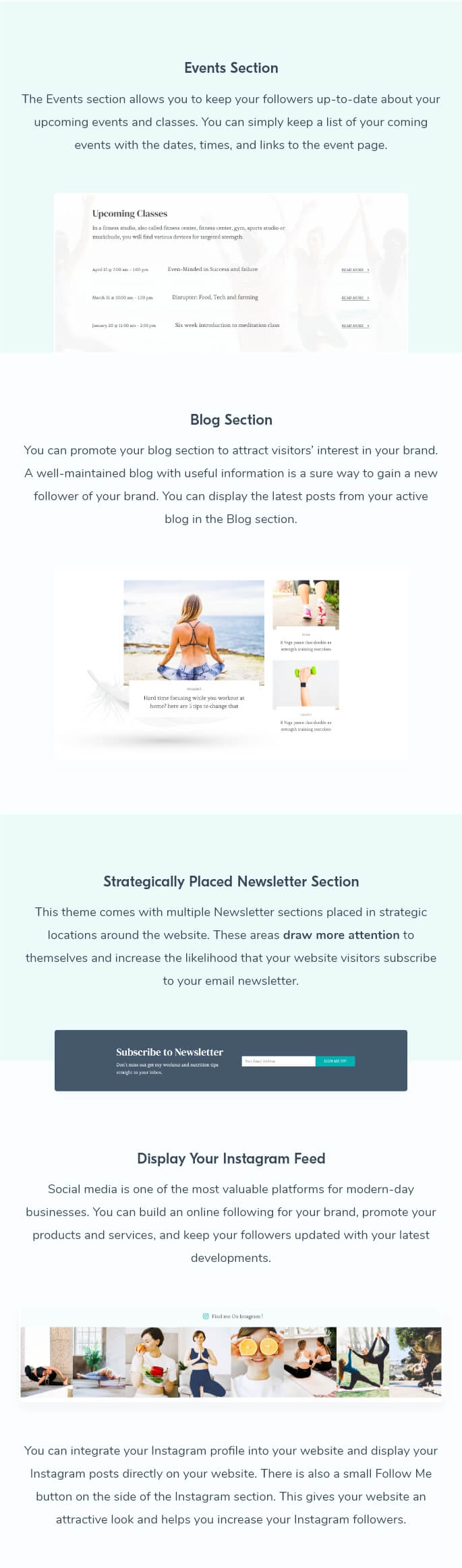 This theme provides you with a pre-built Events page template where you can upload details of all your upcoming events or workshops with more information such as location, date, time, and so on.