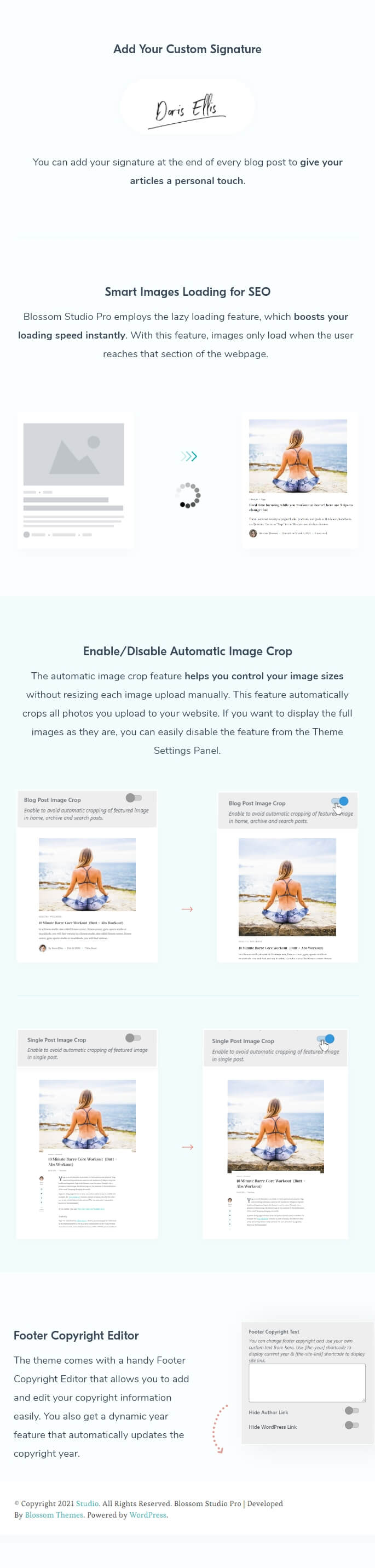 The theme comes with a handy Footer Copyright Editor that allows you to add and edit your copyright information easily. You also get a dynamic year feature that automatically updates the copyright year.