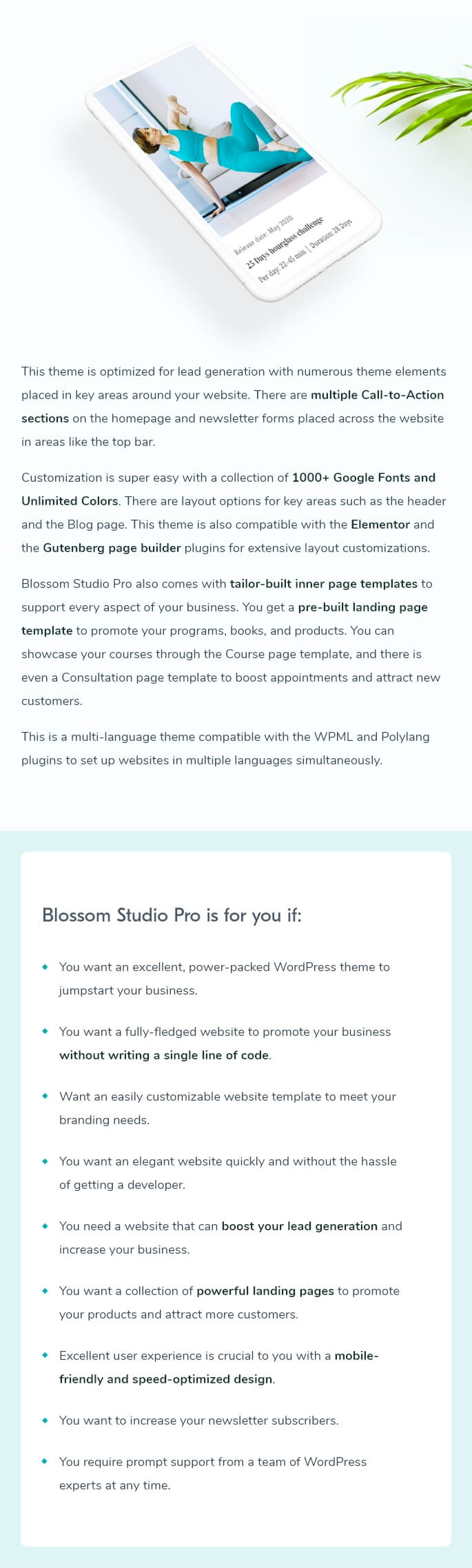 The Blossom Studio Pro theme is a versatile feminine professional WordPress theme useful for any health, movement, or even specialised diet, female or other content creator website. The free version of the theme was terrific, yet it was more than worth the upgrade to get the unique features available to pro customers. The support is fantastic! They answer quite rapidly, and the theme customer support is always very kind and professional (and solves issues or answers questions rapidly). Some unique features of this theme are that Blossom Studio Pro is designed to help you create pages for and easily promote your health and wellness programs, books, and products. We are so happy that we upgraded to pro. Thank you, Blossom Themes! x