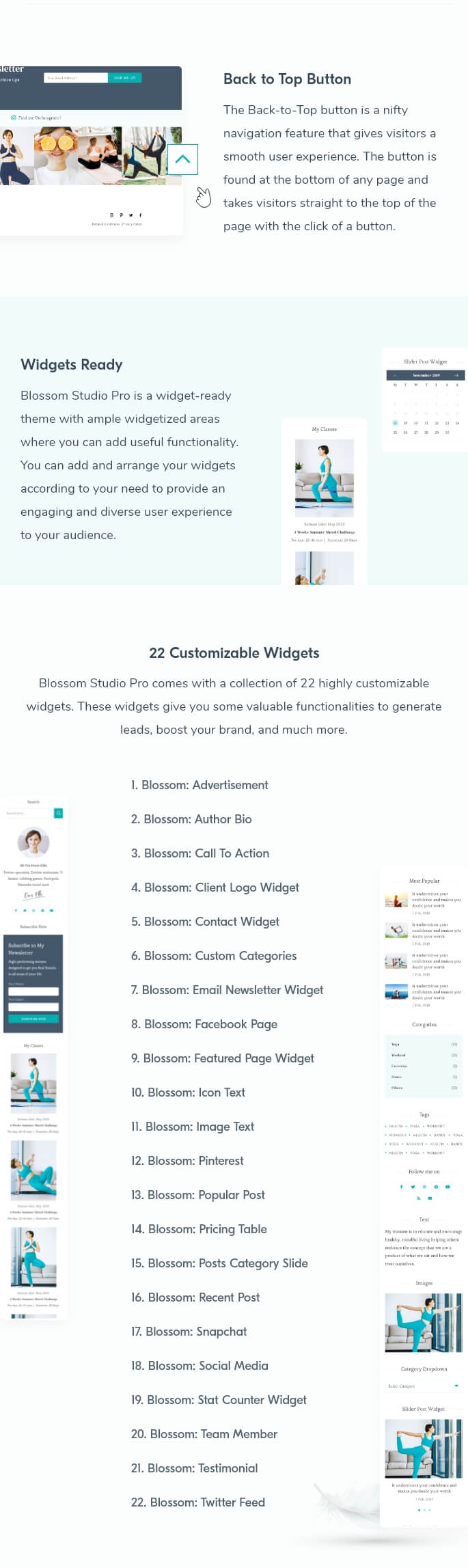 Blossom Studio Pro comes with a collection of 22 highly customizable widgets. These widgets give you some valuable functionalities to generate leads, boost your brand, and much more.