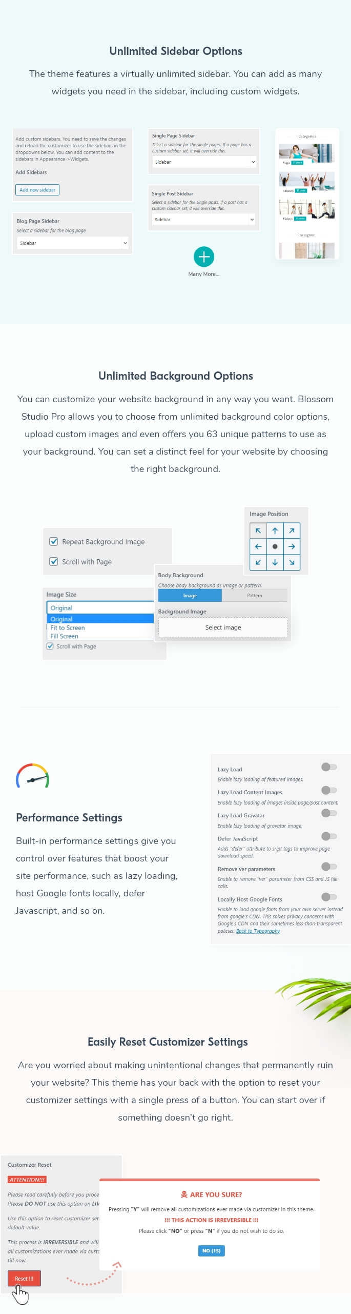 Are you worried about making unintentional changes that permanently ruin your website? This theme has your back with the option to reset your customizer settings with a single press of a button. You can start over if something doesn’t go right.