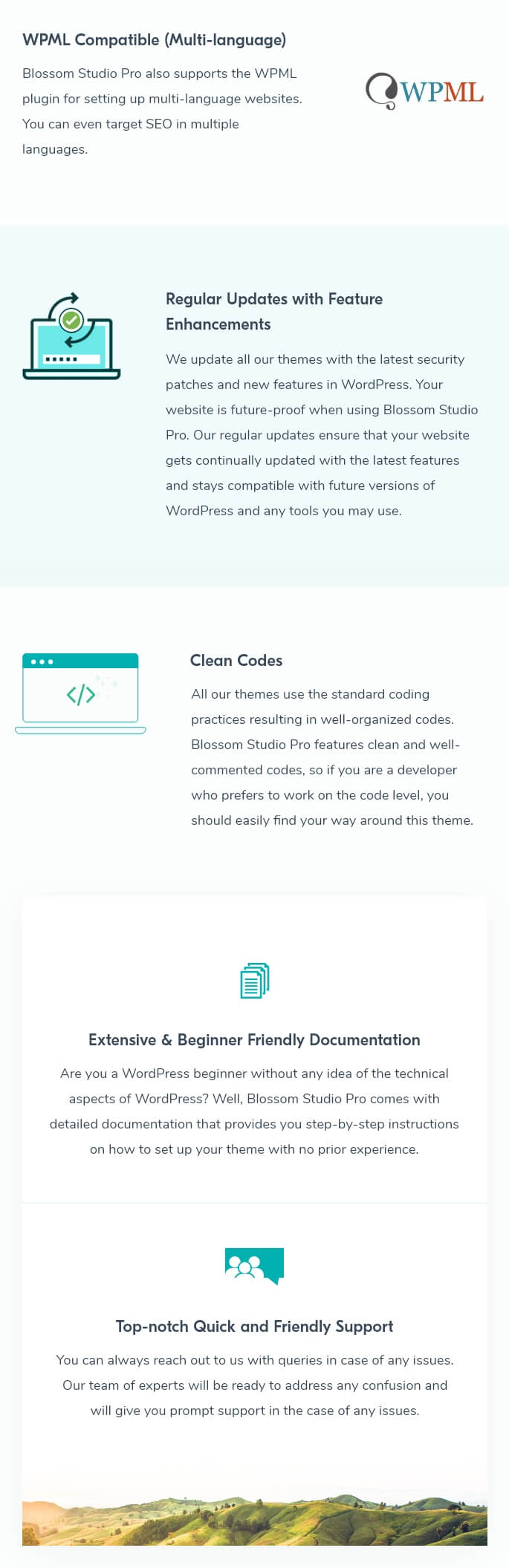 We update all our themes with the latest security patches and new features in WordPress. Your website is future-proof when using Blossom Studio Pro. Our regular updates ensure that your website gets continually updated with the latest features and stays compatible with future versions of WordPress and any tools you may use.