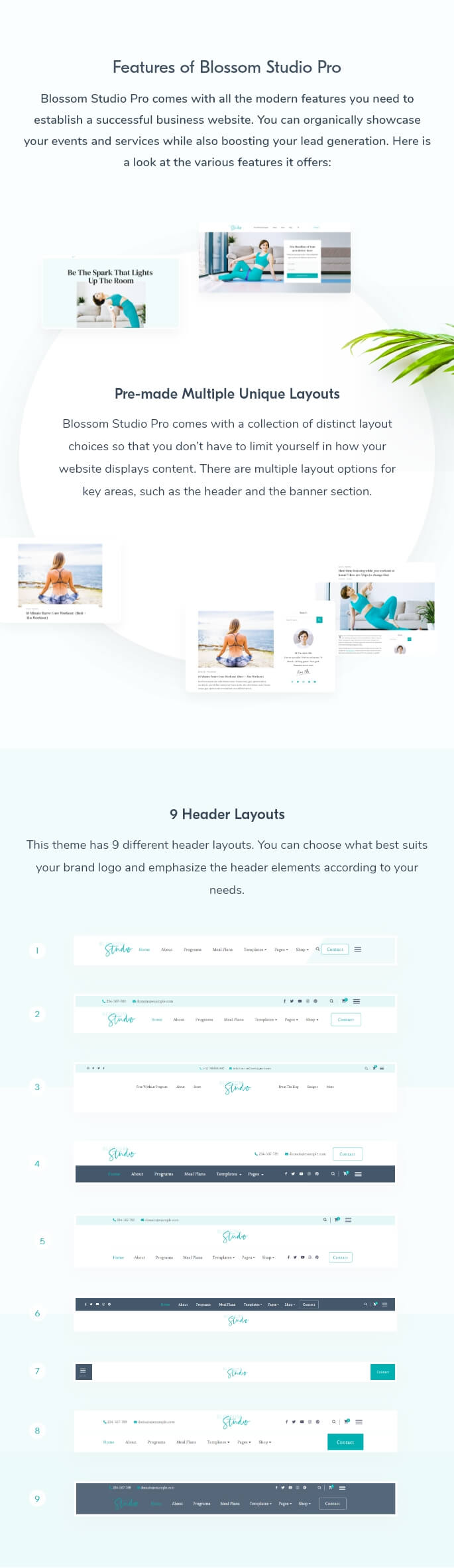 Blossom Studio Pro comes with a collection of distinct layout choices so that you don’t have to limit yourself in how your website displays content. There are multiple layout options for key areas, such as the header and the banner section.