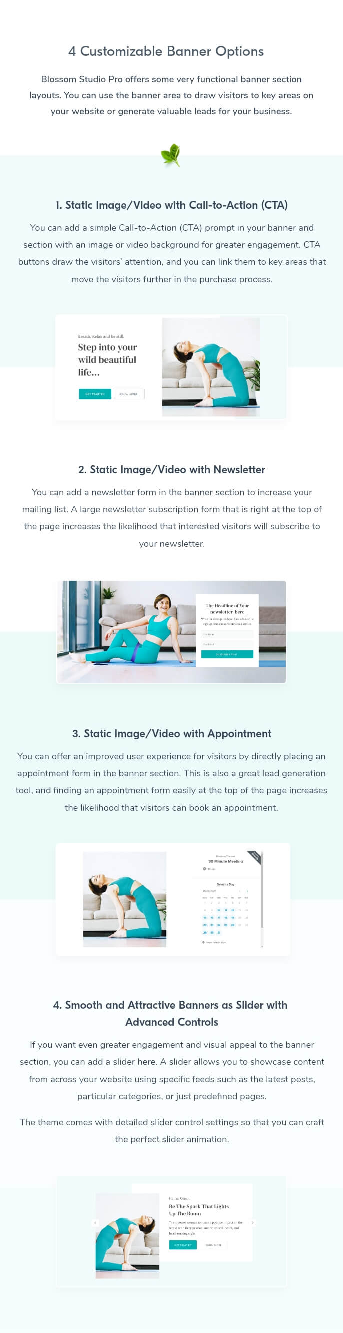 Blossom Studio Pro offers some very functional banner section layouts. You can use the banner area to draw visitors to key areas on your website or generate valuable leads for your business.