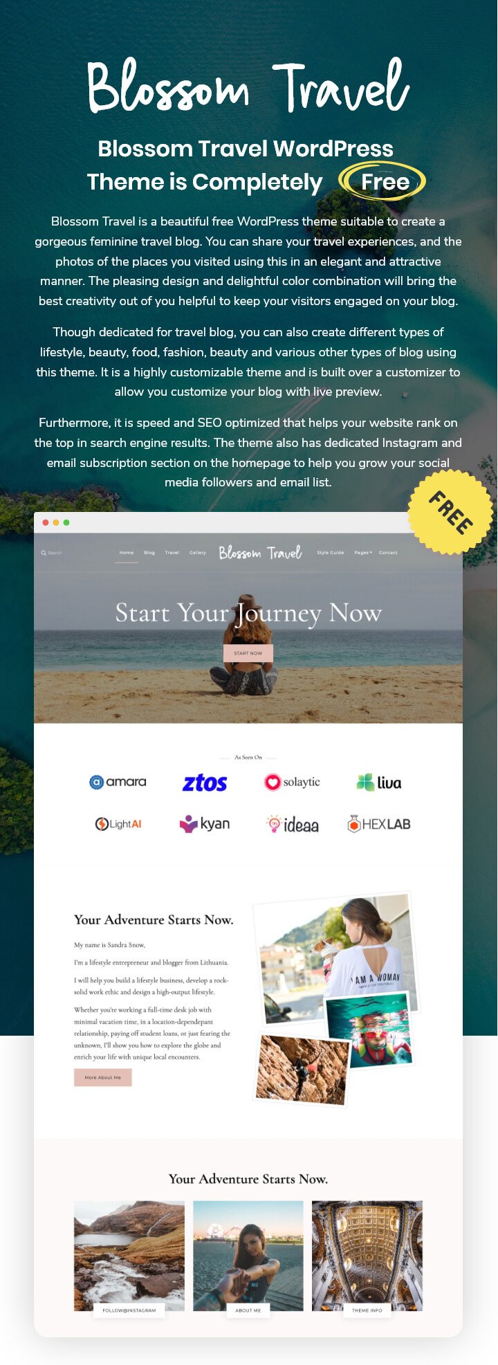 Though dedicated for travel blog, you can also create different types of lifestyle, beauty, food, fashion, beauty and various other types of blog using this theme. It is a highly customizable theme and is built over a customizer to allow you customize your blog with live preview.