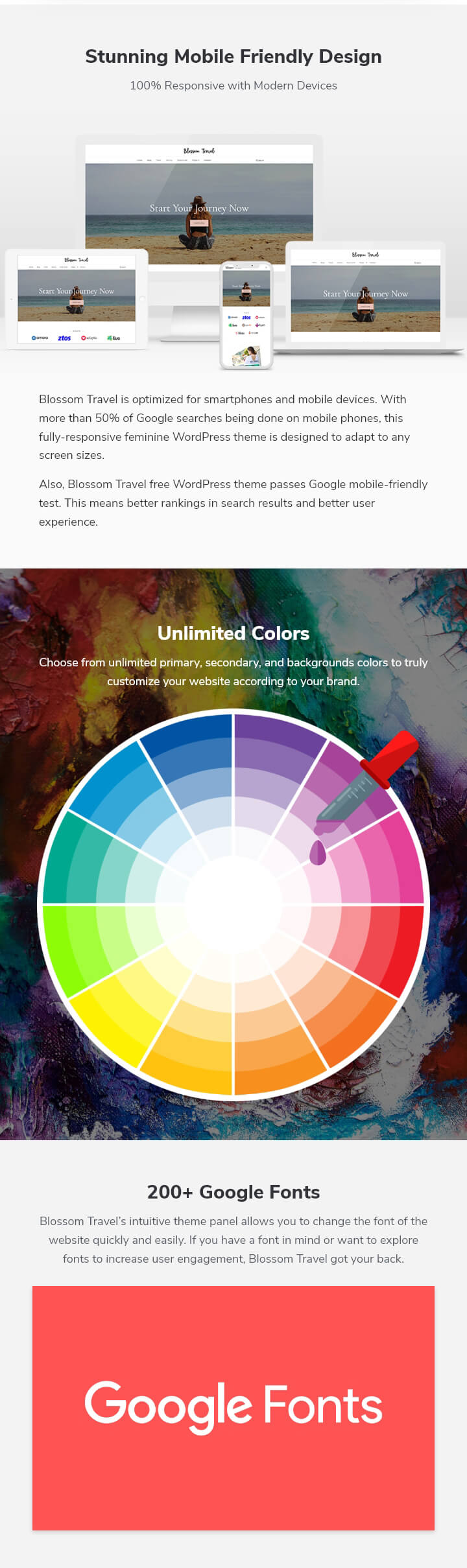Blossom Travel is optimized for smartphones and mobile devices. With more than 50% of Google searches being done on mobile phones, this fully-responsive feminine WordPress theme is designed to adapt to any screen sizes.