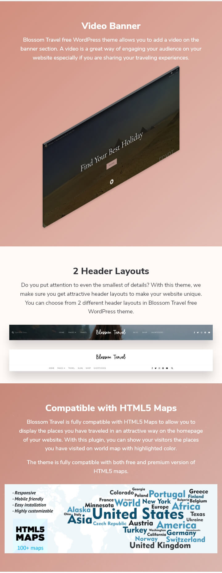 Blossom Travel is fully compatible with HTML5 Maps to allow you to display the places you have traveled in an attractive way on the homepage of your website. With this plugin, you can show your visitors the places you have visited on the world map with highlighted color.