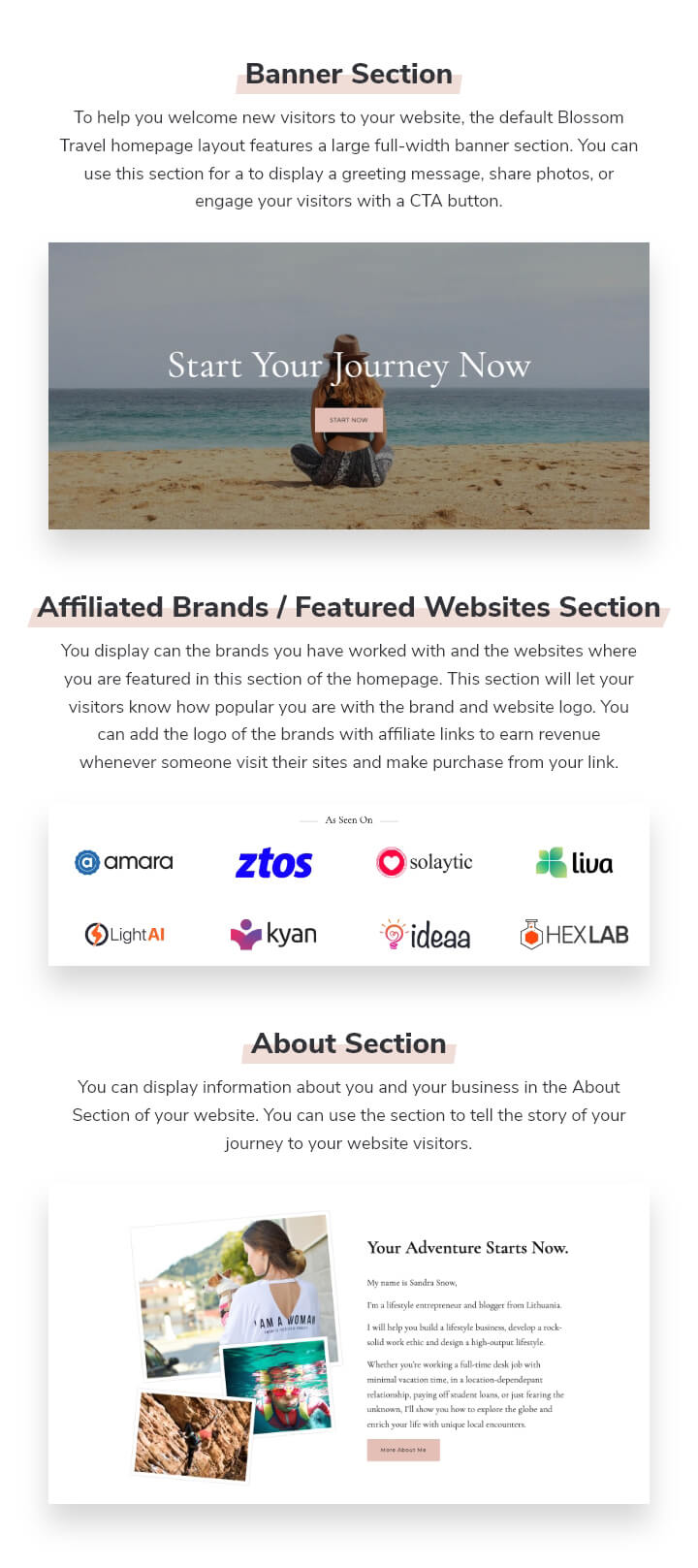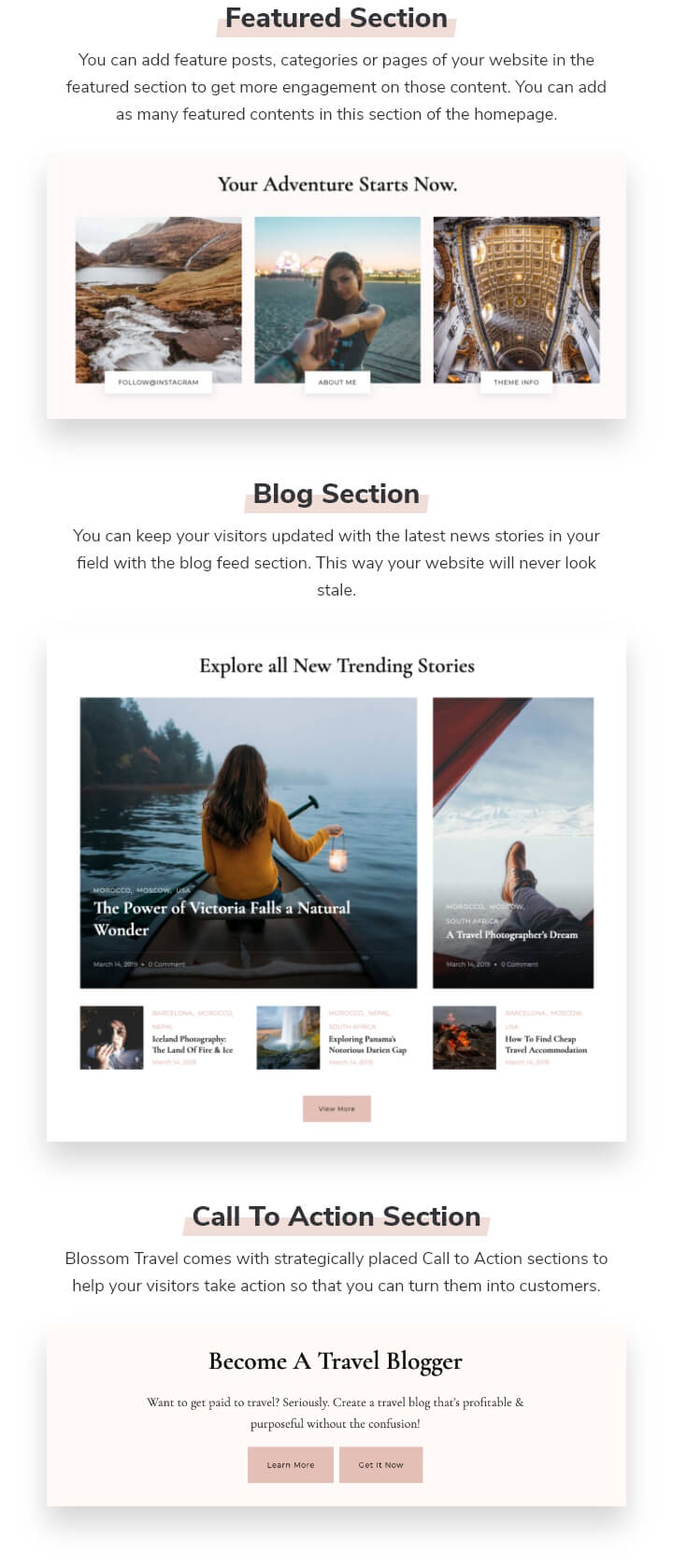 Blossom Travel comes with strategically placed Call to Action sections to help your visitors take action so that you can turn them into customers.