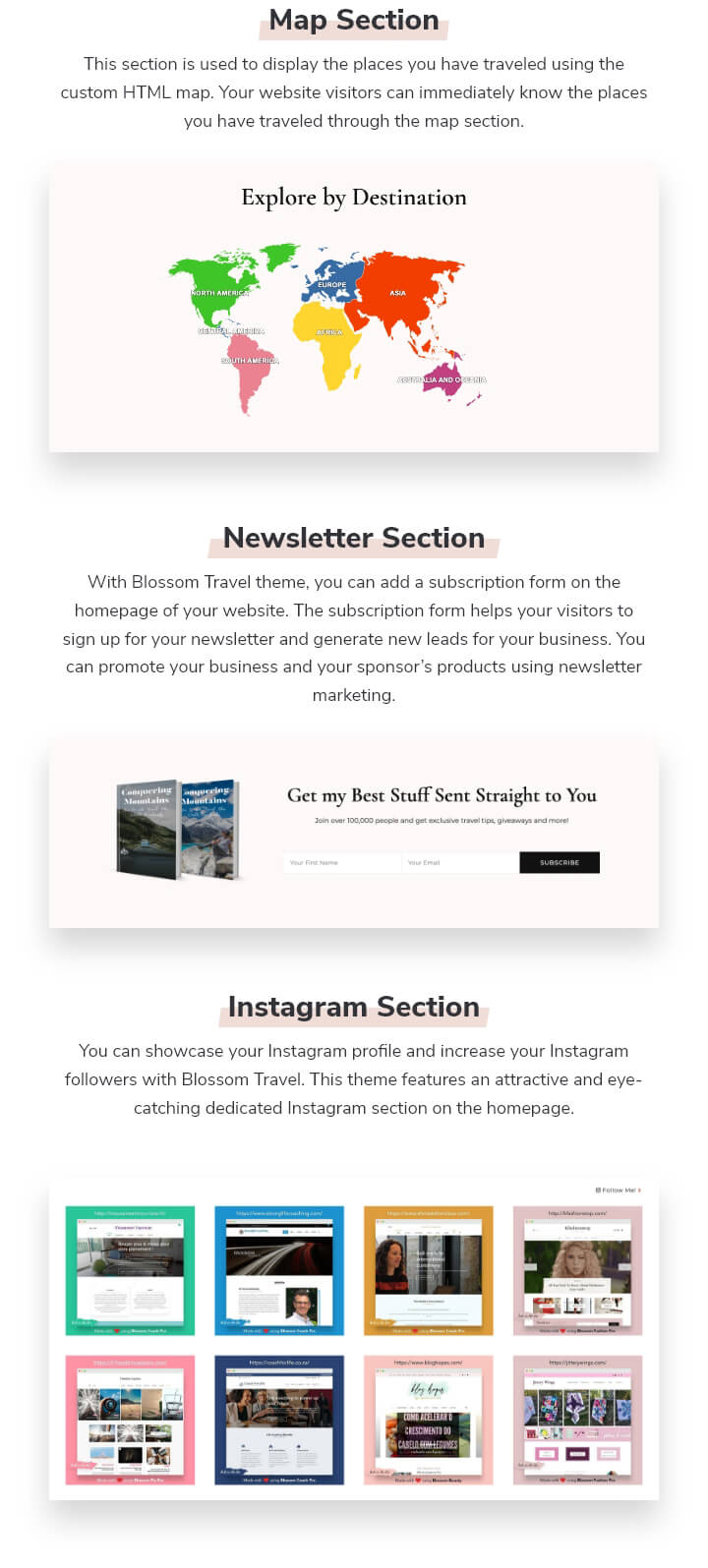 You can showcase your Instagram profile and increase your Instagram followers with Blossom Travel. This theme features an attractive and eye-catching dedicated Instagram section on the homepage.