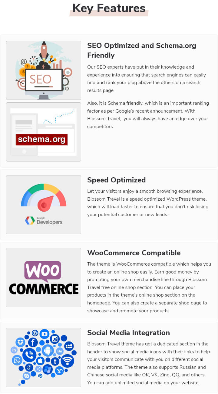 Also, it is Schema friendly, which is an important ranking factor as per Google’s recent announcement. With Blossom Travel, you will always have an edge over your competitors.
