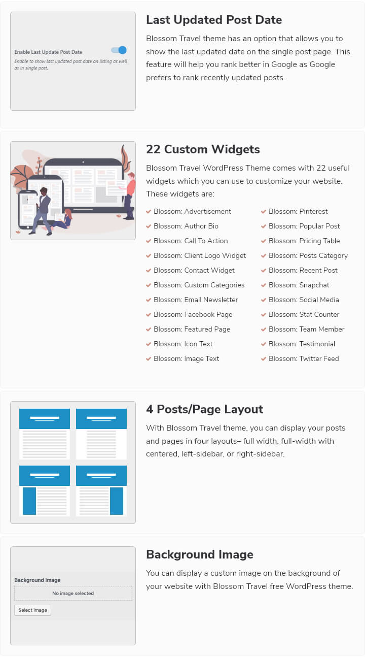 Blossom Travel WordPress Theme comes with 22 useful widgets which you can use to customize your website. These widgets are: