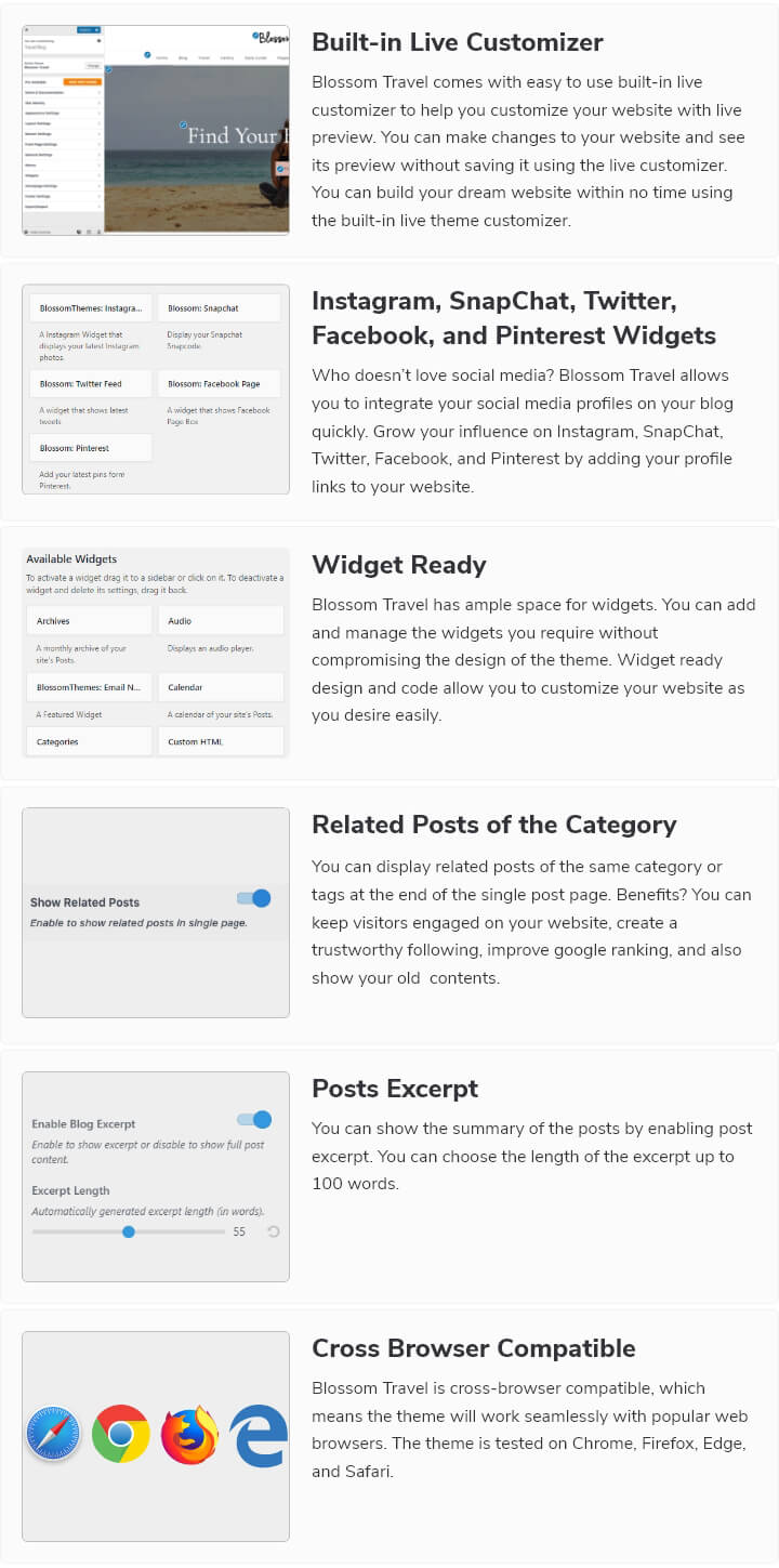 Blossom Travel is cross-browser compatible, which means the theme will work seamlessly with popular web browsers. The theme is tested on Chrome, Firefox, Edge, and Safari.