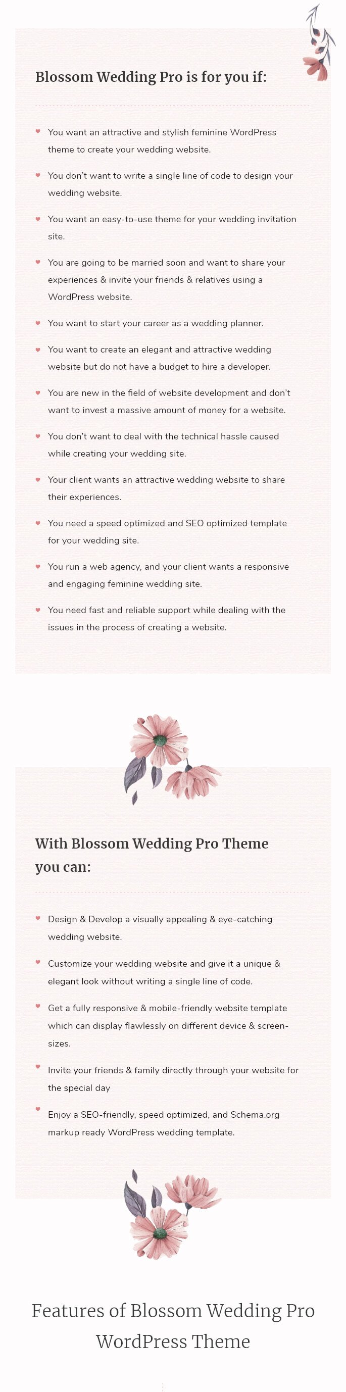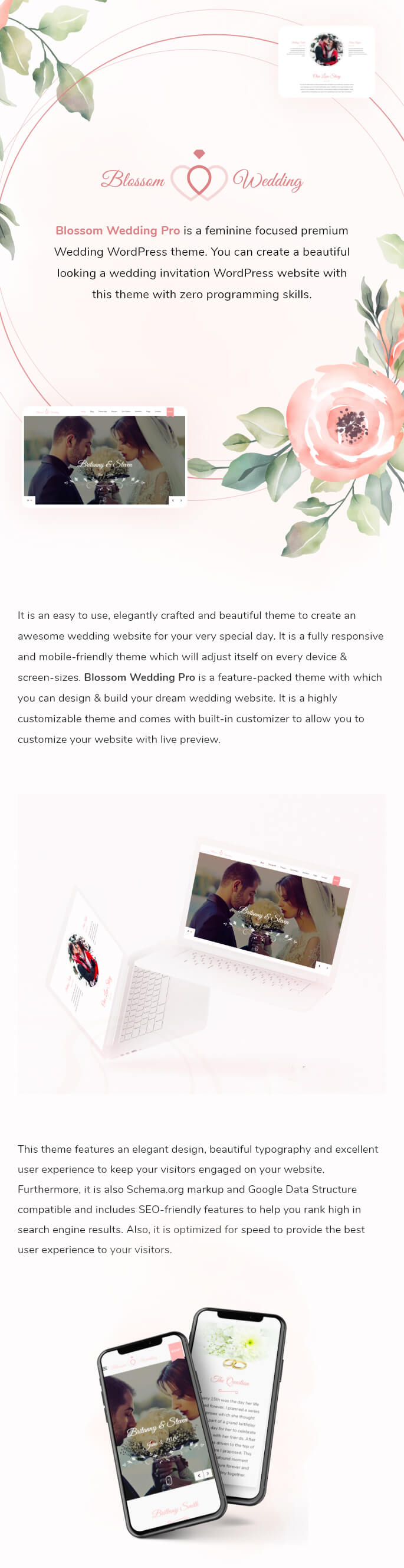 Blossom Wedding Pro is a feminine focused premium Wedding WordPress theme. You can create a beautiful looking a wedding invitation WordPress website with this theme with zero programming skills. It is an easy to use, elegantly crafted and beautiful theme to create an awesome wedding website for your very special day. It is a fully responsive and mobile-friendly theme which will adjust itself on every device & screen-sizes. Blossom Wedding Pro is a feature-packed theme with which you can design & build your dream wedding website. It is a highly customizable theme and comes with built-in customizer to allow you to customize your website with live preview.