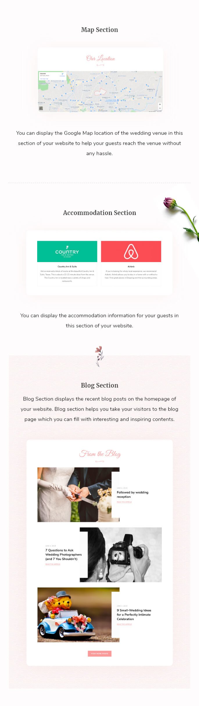 You can display your wedding information along with other information such as Venue Details, Google Map, Date & Time to allow your visitors take action on your website.
