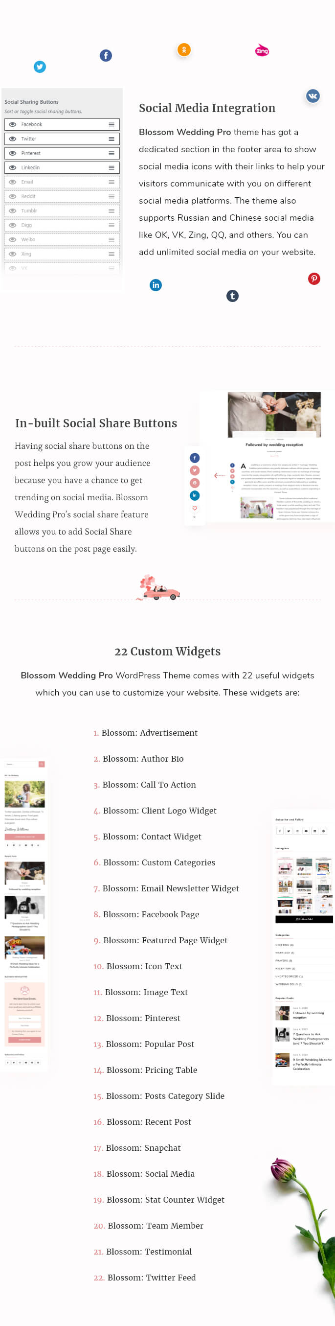 Blossom Wedding Pro theme has got a dedicated section in the footer area to show social media icons with their links to help your visitors communicate with you on different social media platforms. The theme also supports Russian and Chinese social media like OK, VK, Zing, QQ, and others. You can add unlimited social media on your website.