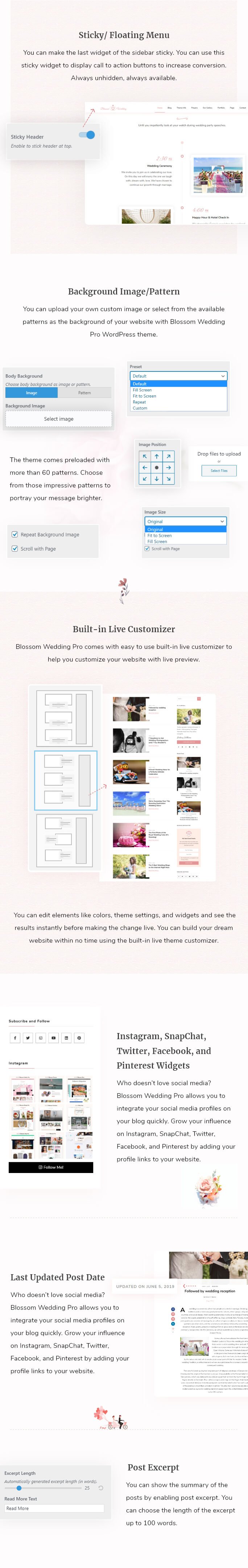 Blossom Wedding Pro has ample space for widgets. You can add and manage the widgets you require without compromising the design of the theme. Widget ready design and code allow you to customize your website as you desire easily.