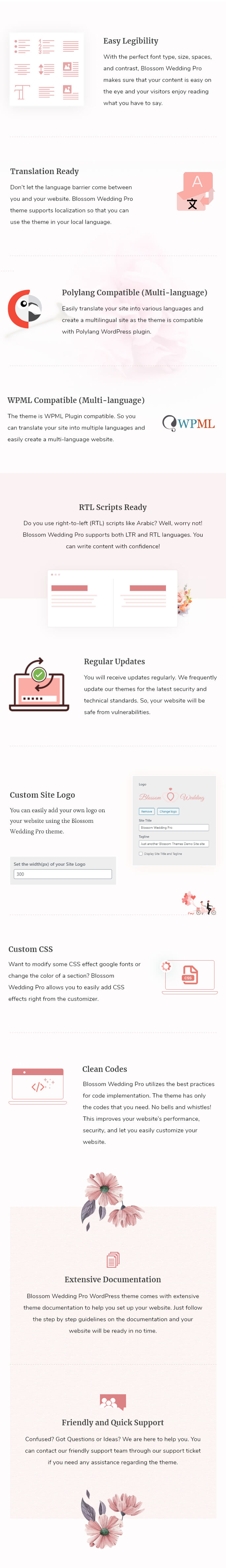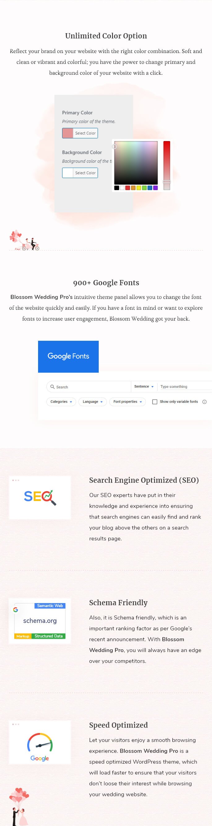 Blossom Wedding Pro utilizes the best practices for code implementation. The theme has only the codes that you need. No bells and whistles! This improves your website’s performance, security, and let you easily customize your website.
