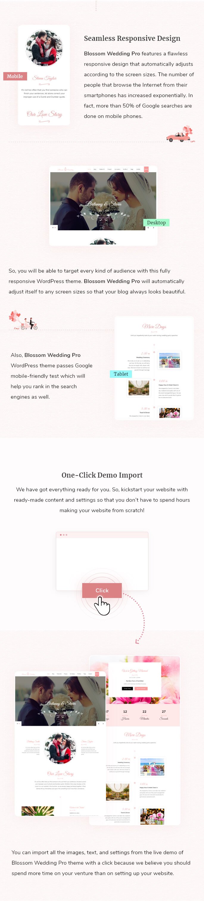 You can import all the images, text, and settings from the live demo of Blossom Wedding Pro theme with a click because we believe you should spend more time on your venture than on setting up your website.