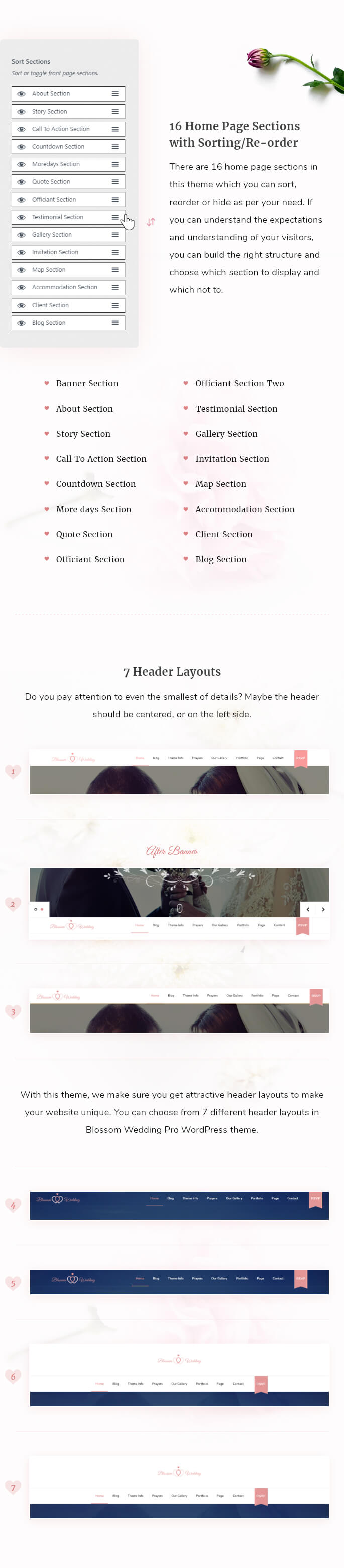 Do you pay attention to even the smallest of details? Maybe the header should be centered, or on the left side. With this theme, we make sure you get attractive header layouts to make your website unique. You can choose from 7 different header layouts in Blossom Wedding Pro WordPress theme.
