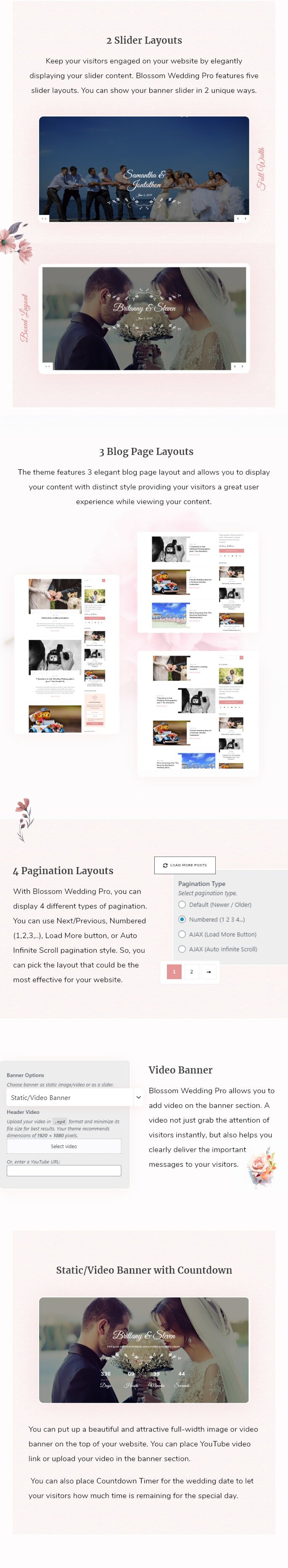 With Blossom Wedding Pro, you can display 4 different types of pagination. You can use Next/Previous, Numbered (1,2,3,..), Load More button, or Auto Infinite Scroll pagination style. So, you can pick the layout that could be the most effective for your website.