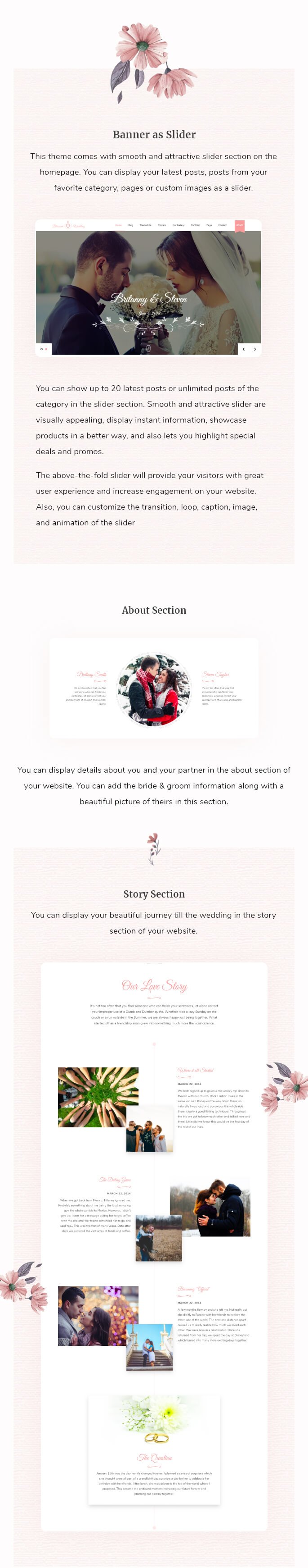 You can put up a beautiful and attractive full-width image or video banner on the top of your website. You can place YouTube video link or upload your video in the banner section. You can also place Countdown Timer for the wedding date to let your visitors how much time is remaining for the special day.