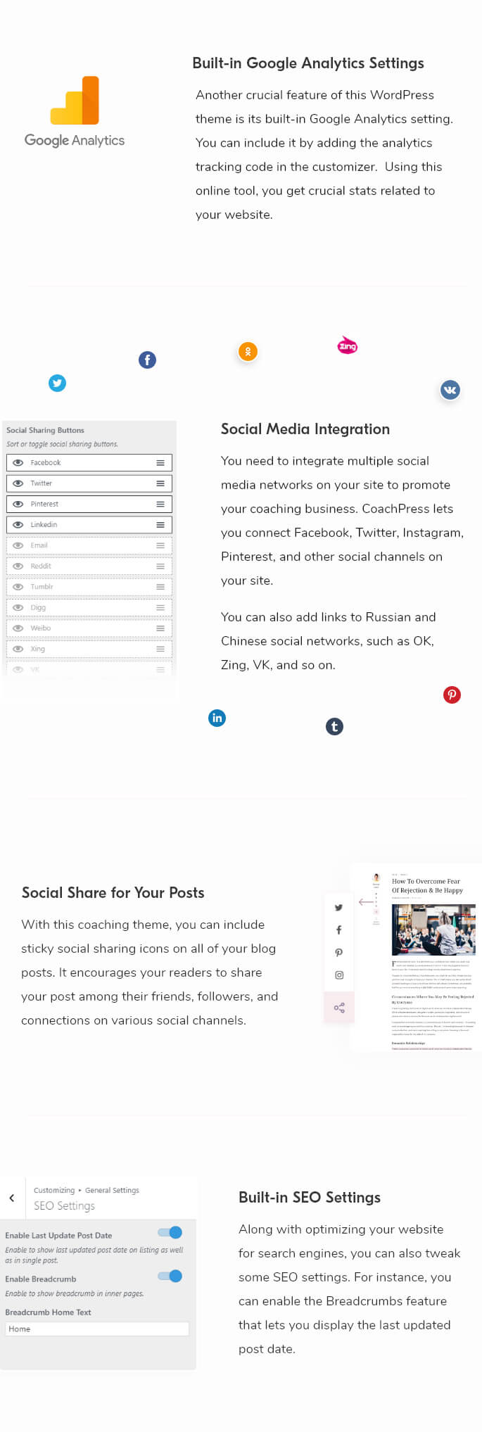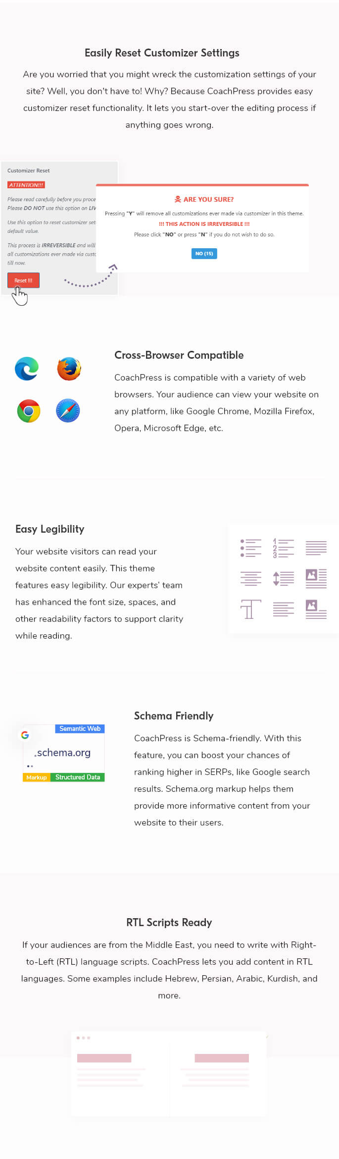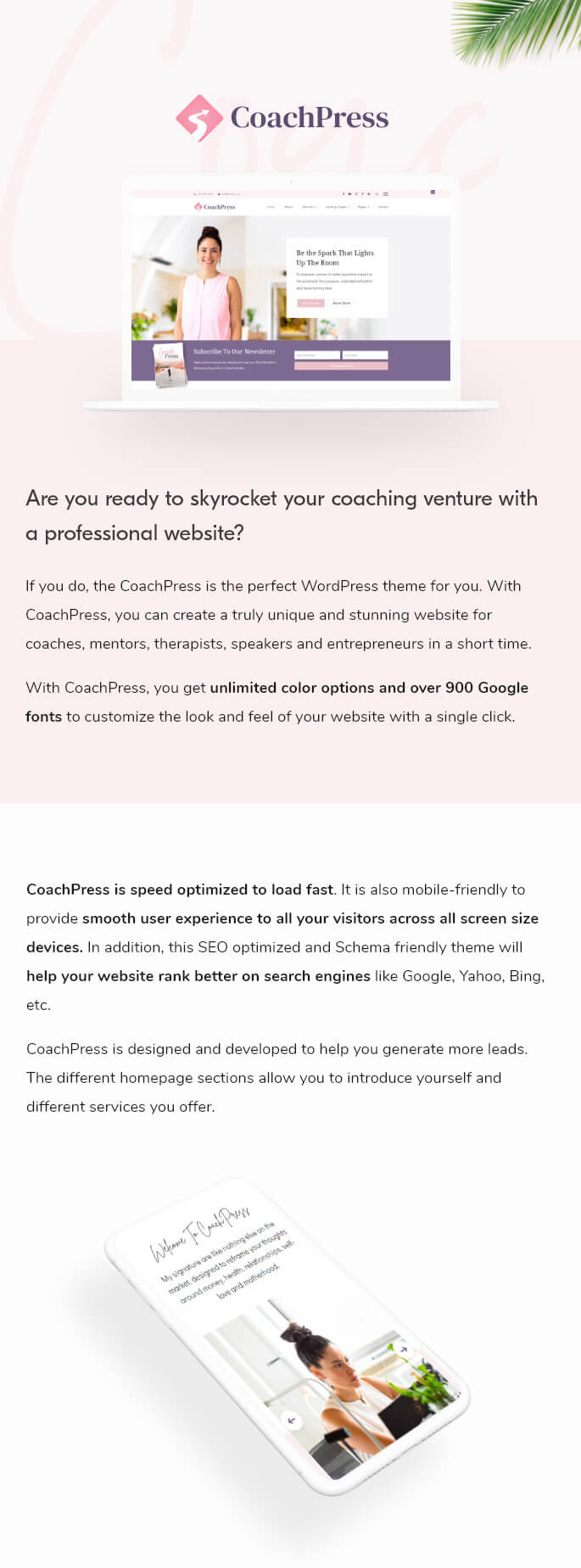 CoachPress is speed optimized to load fast. It is also mobile-friendly to provide a smooth user experience to all your visitors across all screen size devices. In addition, this SEO optimized and Schema friendly theme will help your website rank better on search engines like Google, Yahoo, Bing, etc.