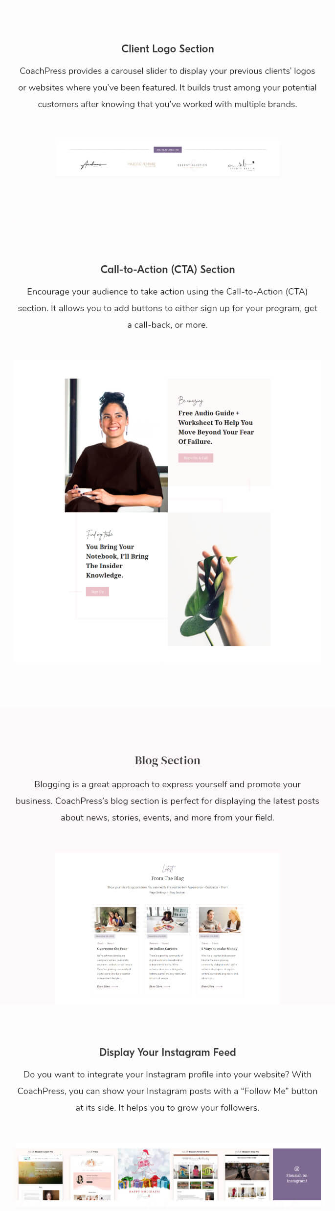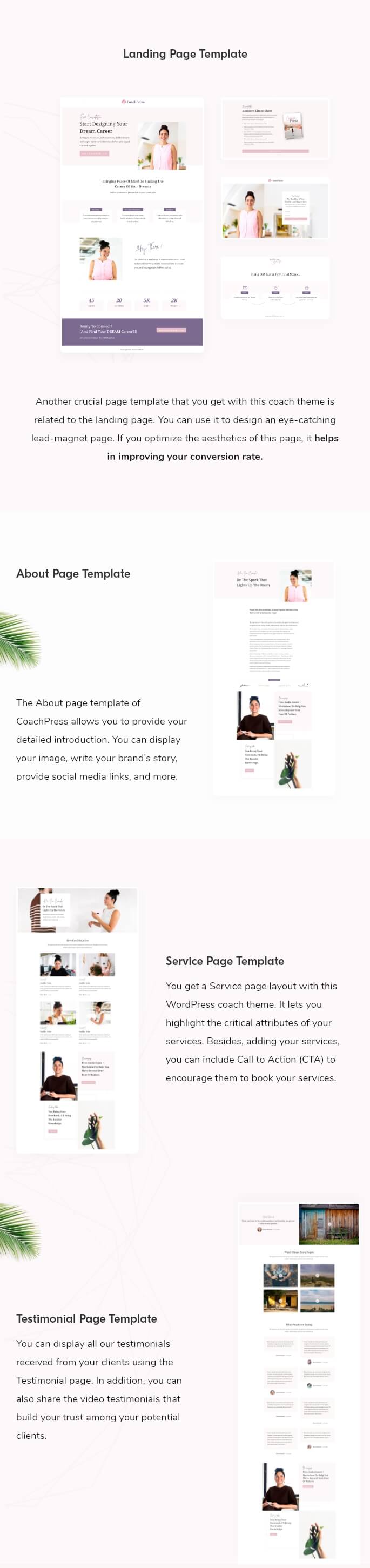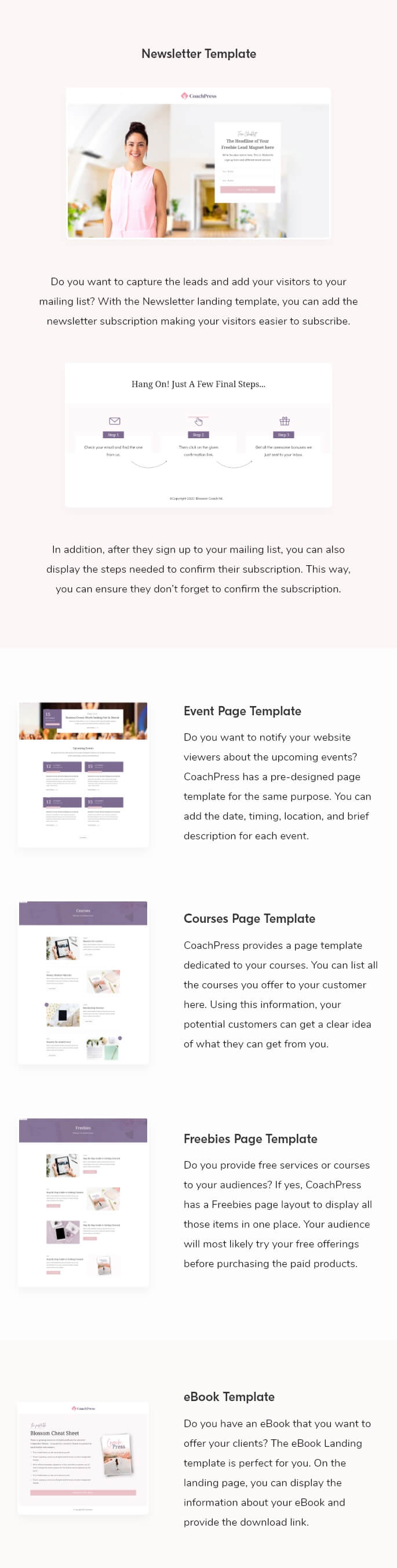With CoachPress, you don’t have to limit your imagination to only a few layout options. It provides several pre-designed templates for different aspects of your website.