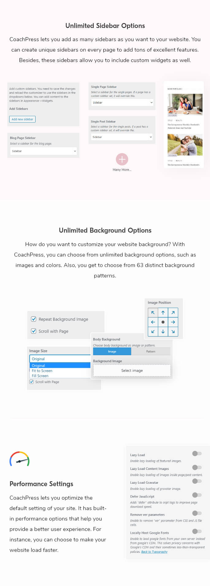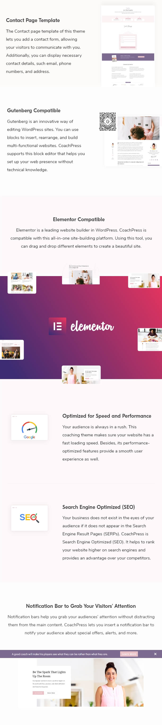 Your audience is always in a rush. This coaching theme makes sure your website has a fast loading speed. Besides, its performance-optimized features provide a smooth user experience as well.