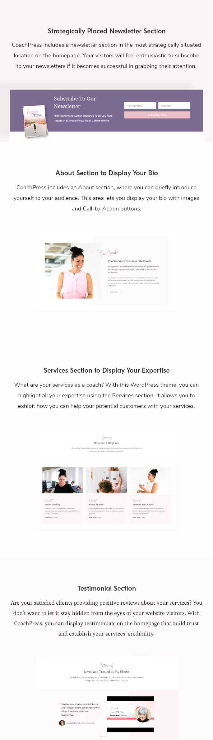 CoachPress is designed and developed to help you generate more leads. The different homepage sections allow you to introduce yourself and the different services you offer.