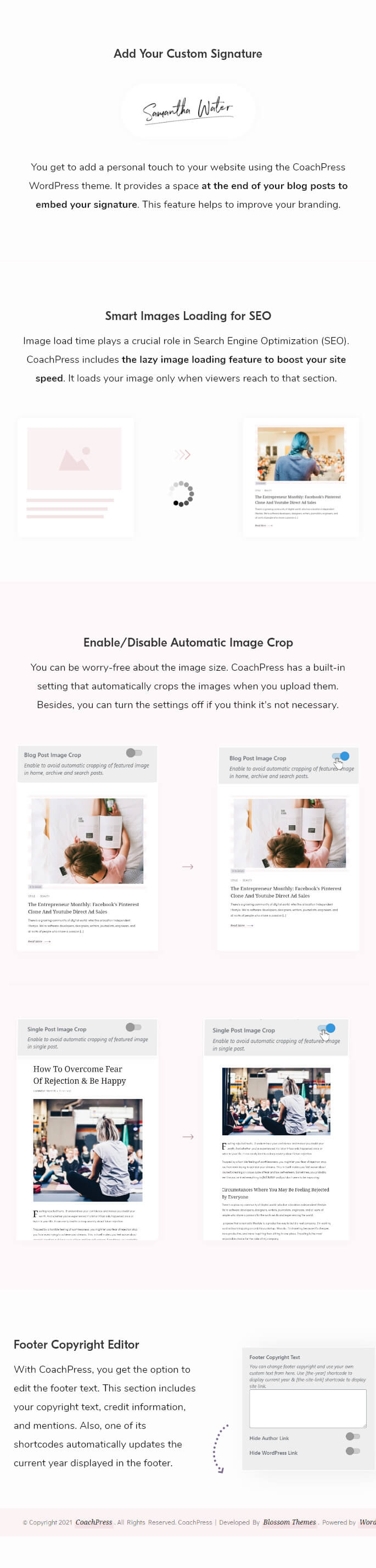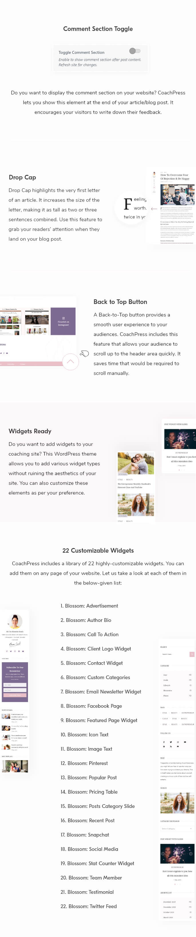 This theme gives me everything I need. It has so many options and I also love the design. Since I started my Blog, I had different themes from Blossom. I all liked them, but the CoachPress Pro is the one I like the most.