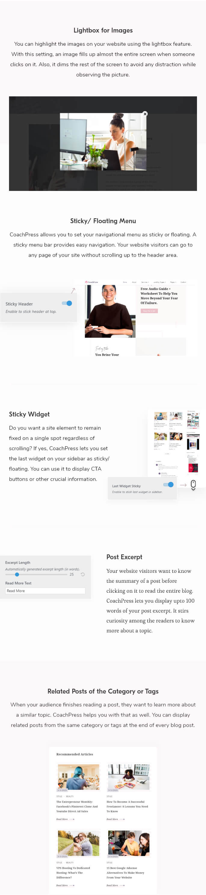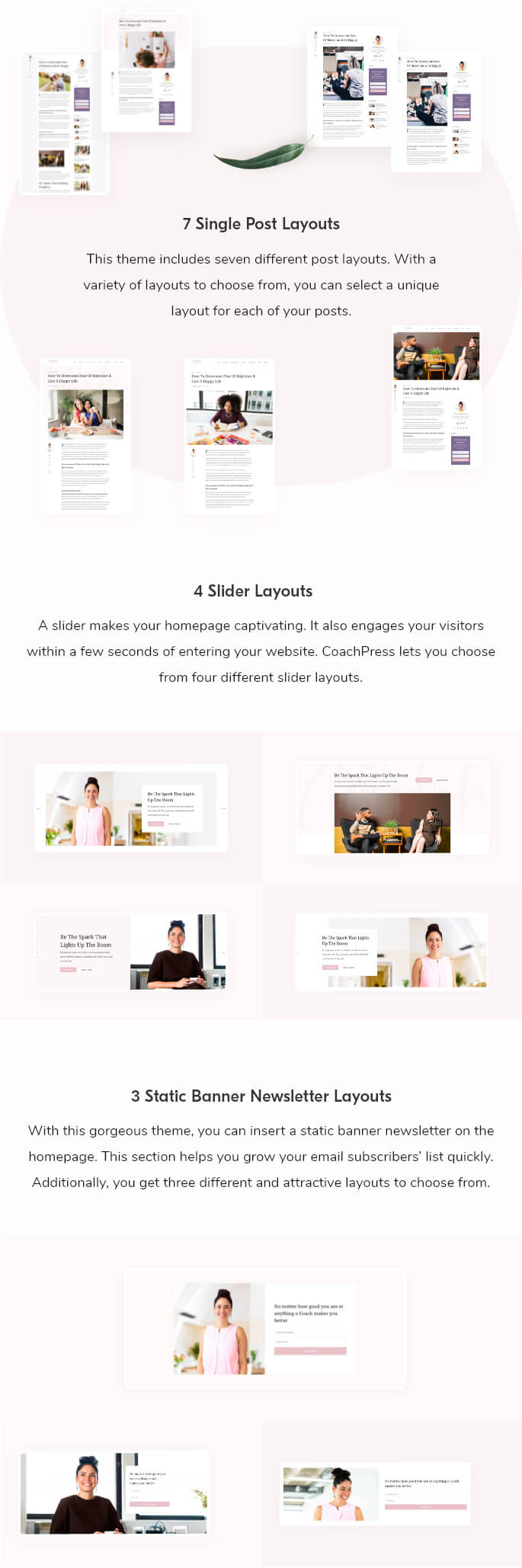 A slider makes your homepage captivating. It also engages your visitors within a few seconds of entering your website. CoachPress lets you choose from four different slider layouts.