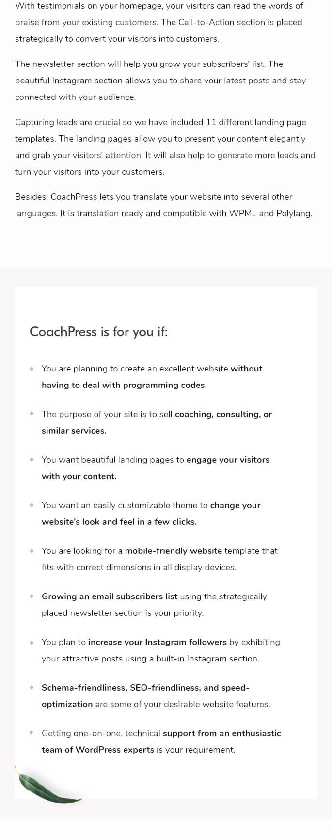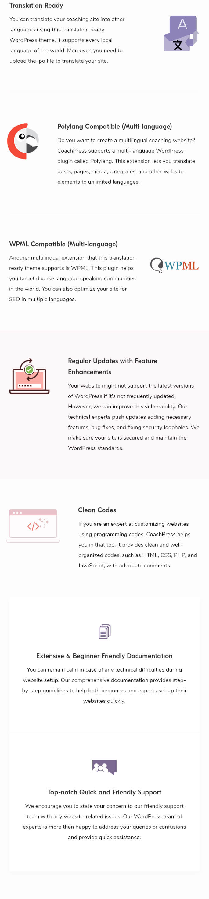 Besides, CoachPress lets you translate your website into several other languages. It is translation ready and compatible with WPML and Polylang.