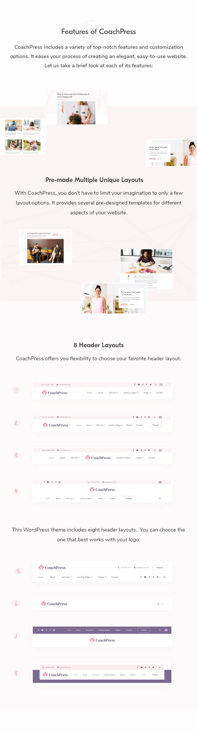 CoachPress offers you the flexibility to choose your favorite header layout. This WordPress theme includes eight header layouts. You can choose the one that best works with your logo.