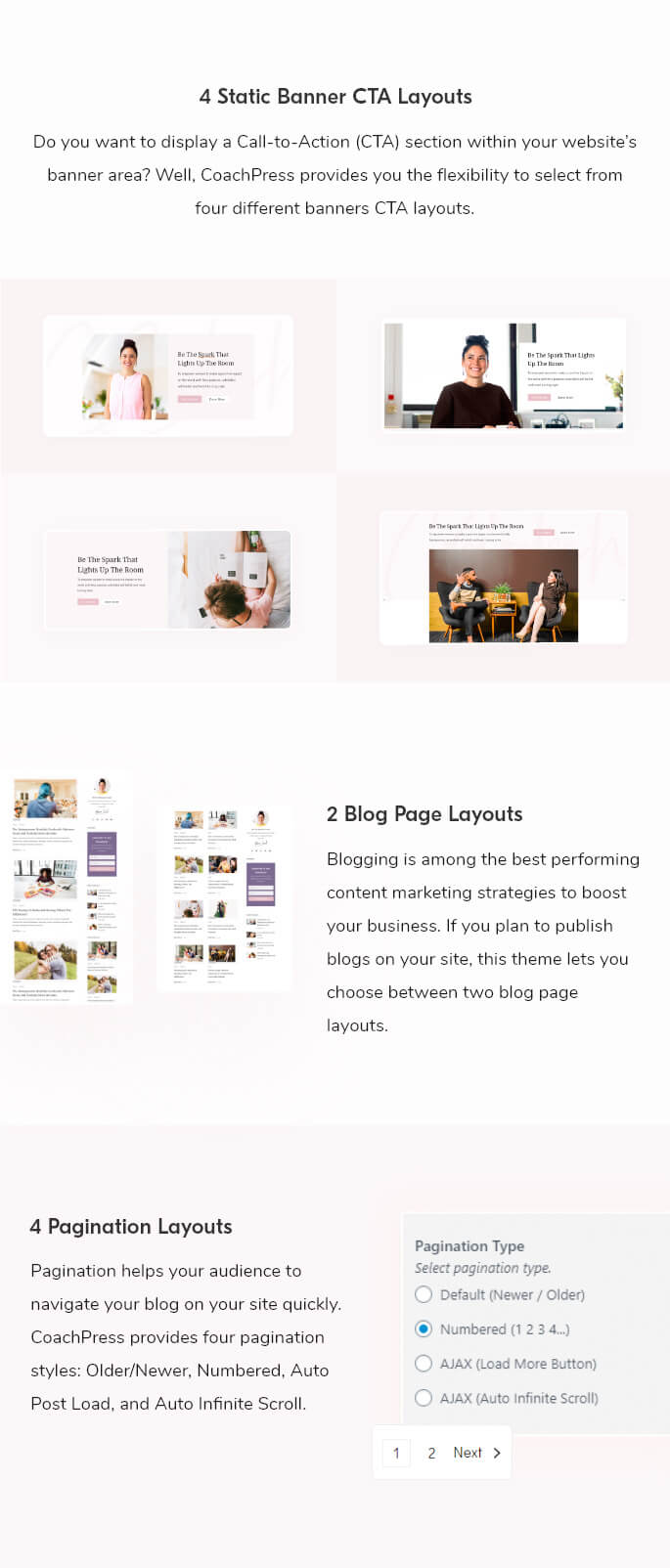 Pagination helps your audience to navigate your blog on your site quickly. CoachPress provides four pagination styles: Older/Newer, Numbered, Auto Post Load, and Auto Infinite Scroll.