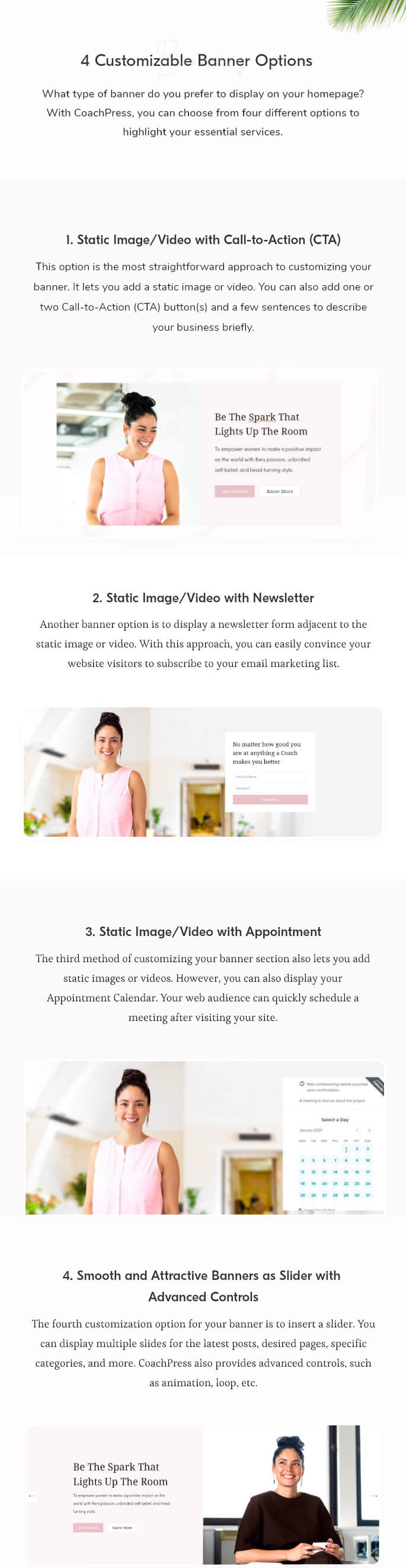 What type of banner do you prefer to display on your homepage? With CoachPress, you can choose from four different options to highlight your essential services.