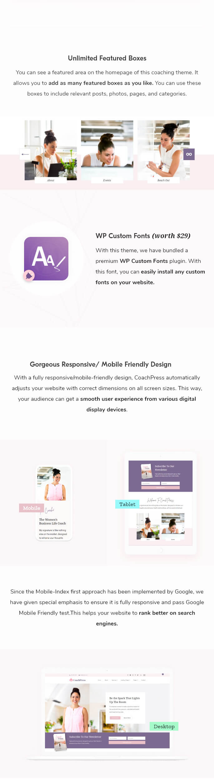 With a fully responsive/mobile-friendly design, CoachPress automatically adjusts your website with correct dimensions on all screen sizes. This way, your audience can get a smooth user experience from various digital display devices.
