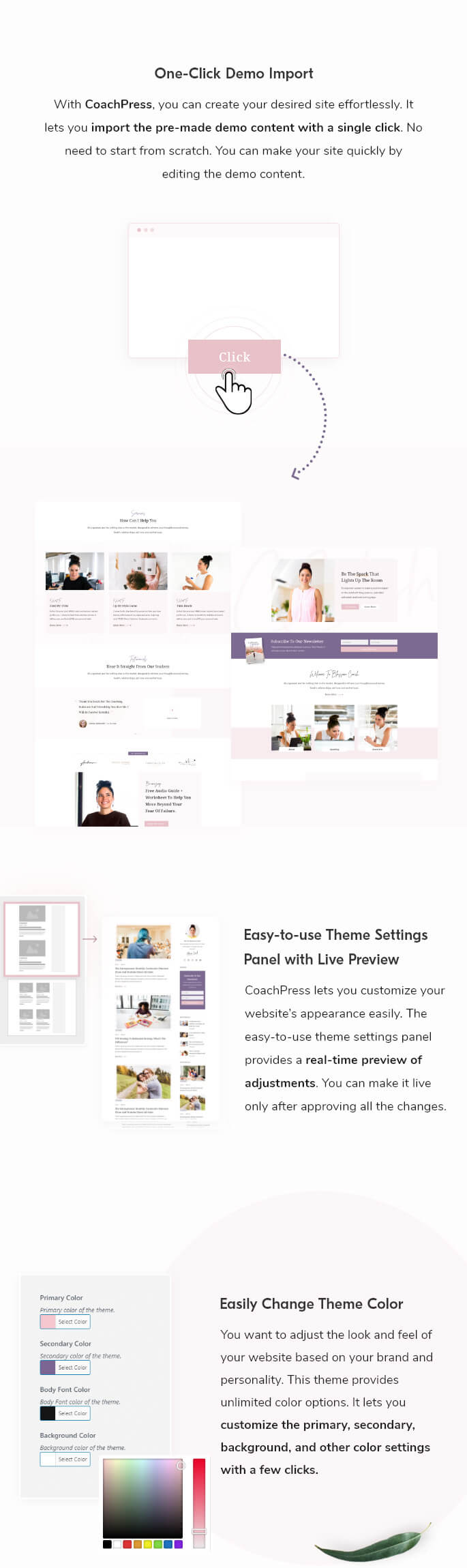 With CoachPress, you can create your desired site effortlessly. It lets you import the pre-made demo content with a single click. No need to start from scratch. You can make your site quickly by editing the demo content.