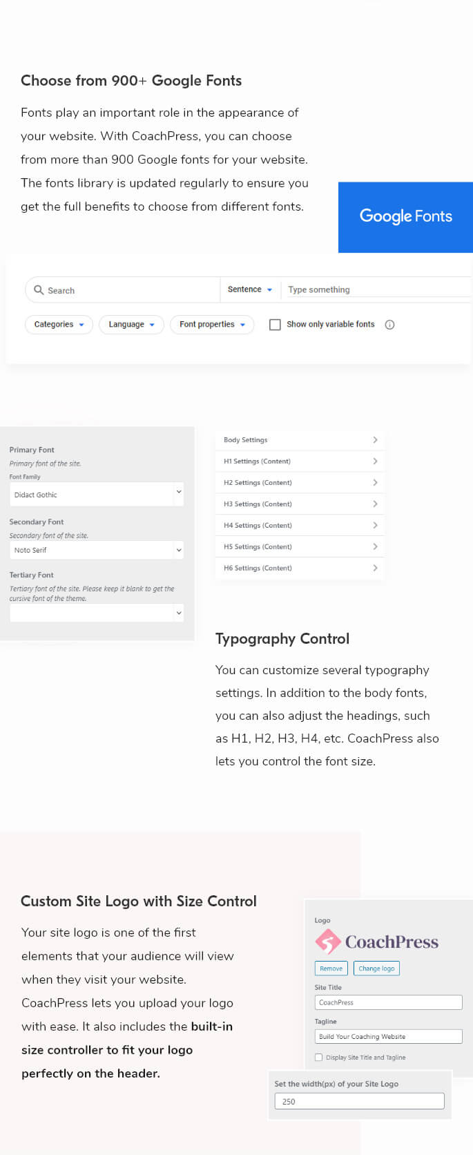 You can customize several typography settings. In addition to the body fonts, you can also adjust the headings, such as H1, H2, H3, H4, etc. CoachPress also lets you control the font size.