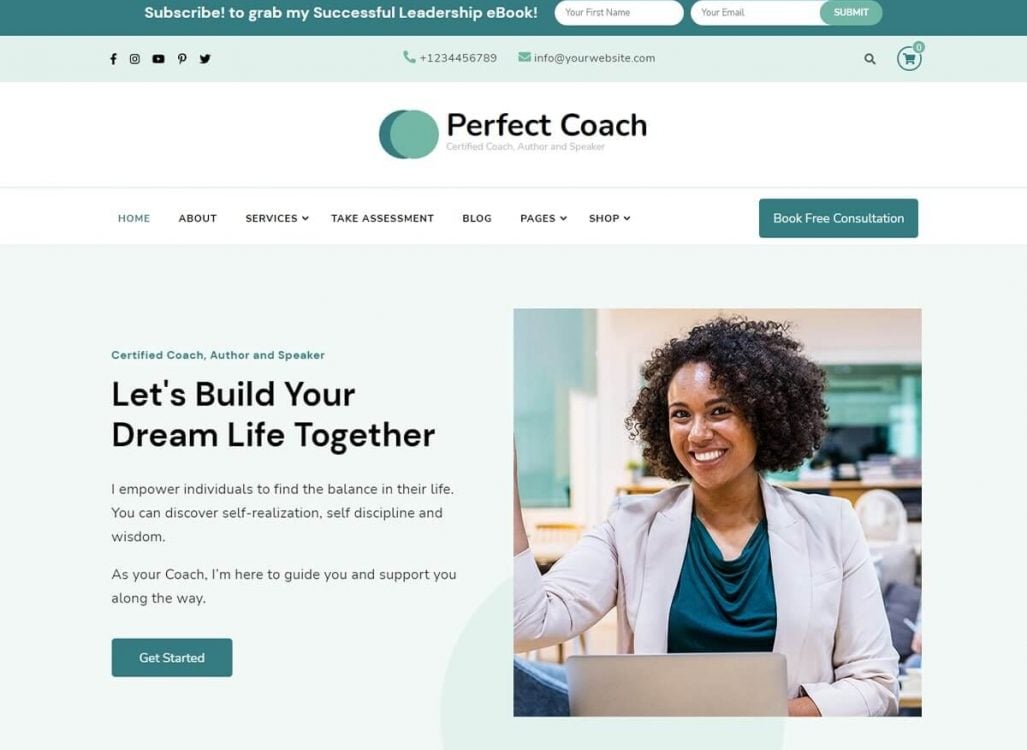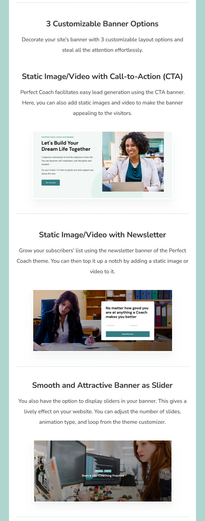 Grow your subscribers’ list using the newsletter banner of the Perfect Coach theme. You can then top it up a notch by adding a static image or video to it.