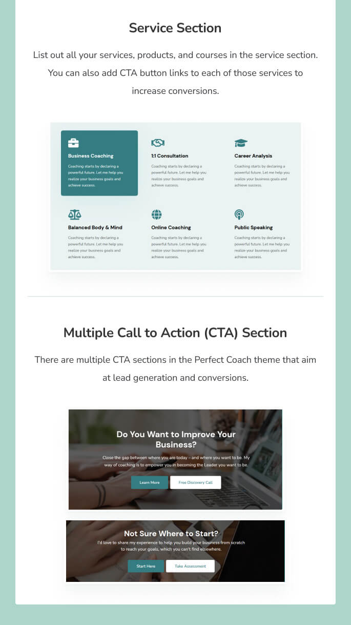There are multiple CTA sections in the Perfect Coach theme that aim at lead generation and conversions.