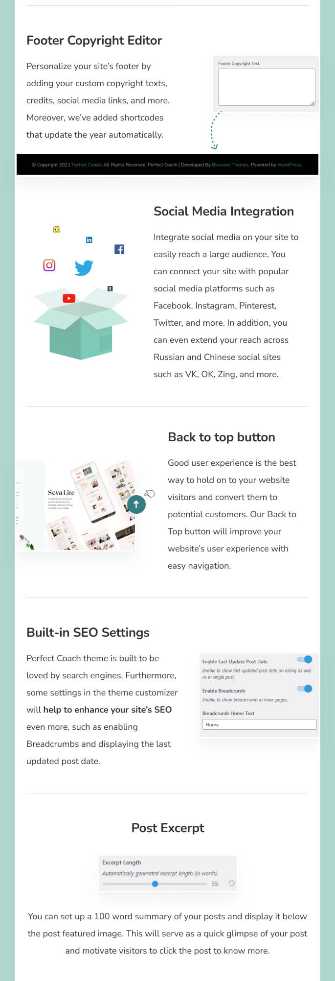 Perfect Coach theme is built to be loved by search engines. Furthermore, some settings in the theme customizer will help to enhance your site’s SEO even more, such as enabling Breadcrumbs and displaying the last updated post date.