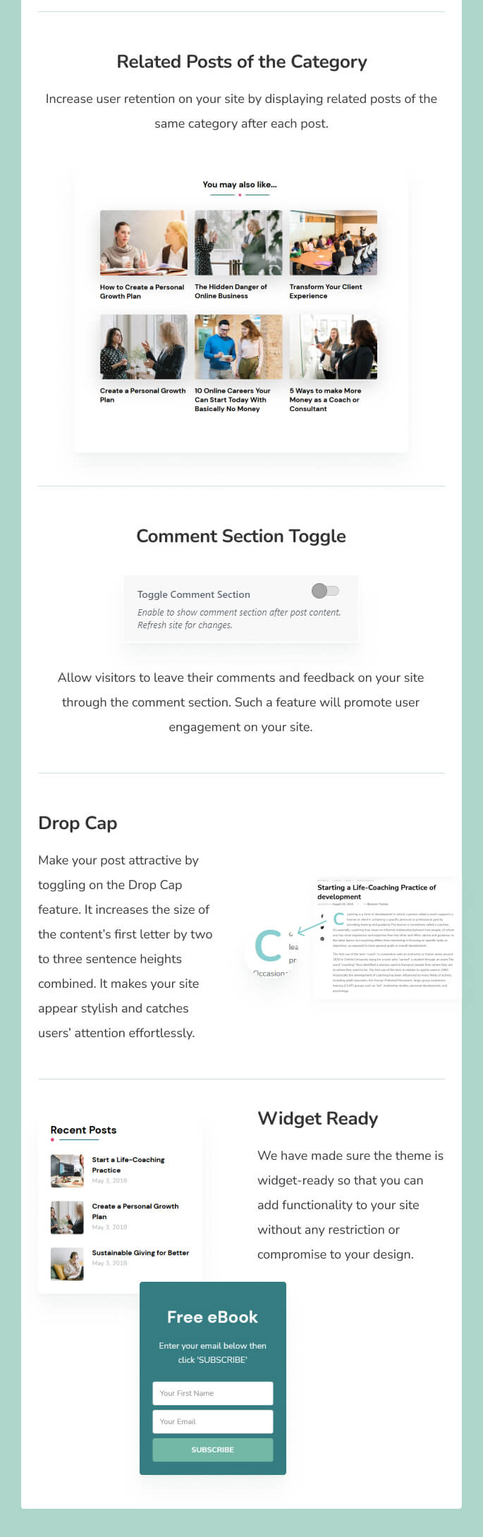 Perfect Coach theme is seamlessly compatible with the BlossomThemes Email Newsletter plugin. Using this plugin, you can add a subscription form to your newsletter section on the go. Such a feature makes it very easy to grow your email subscribers.
