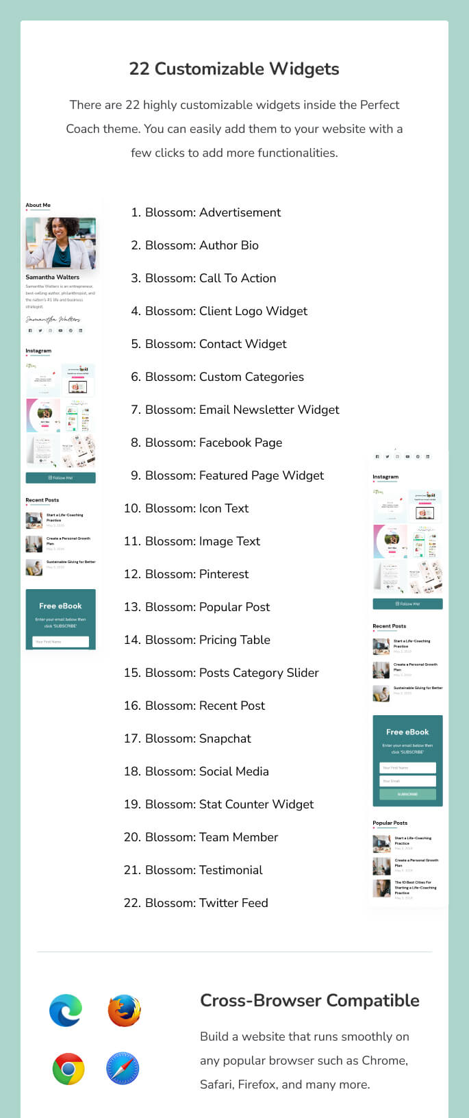 There are 22 highly customizable widgets inside the Perfect Coach theme. You can easily add them to your website with a few clicks to add more functionalities.