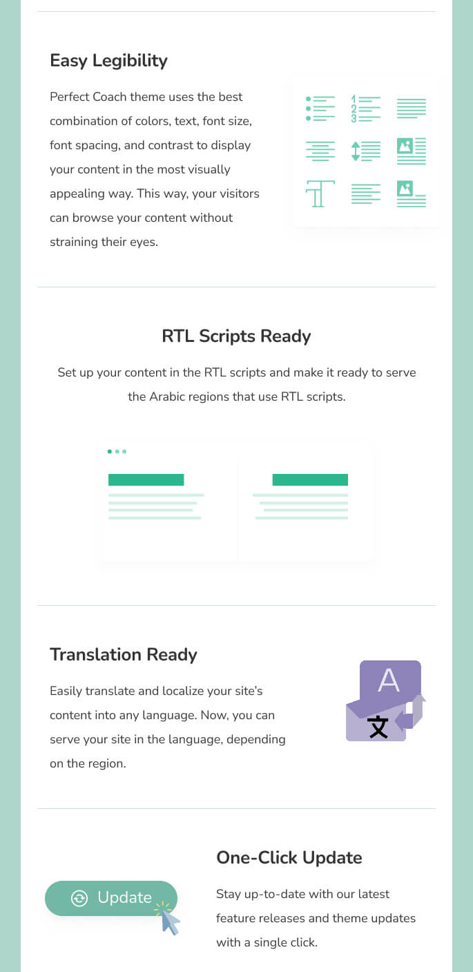 Perfect Coach theme uses the best combination of colors, text, font size, font spacing, and contrast to display your content in the most visually appealing way. This way, your visitors can browse your content without straining their eyes.