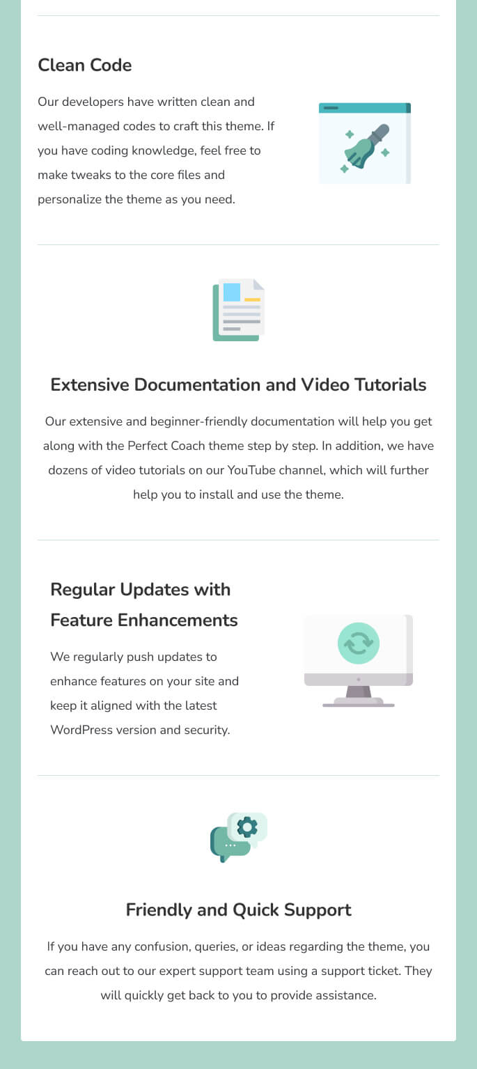 Our extensive and beginner-friendly documentation will help you get along with the Perfect Coach theme step by step. In addition, we have dozens of video tutorials on our YouTube channel, which will further help you to install and use the theme.